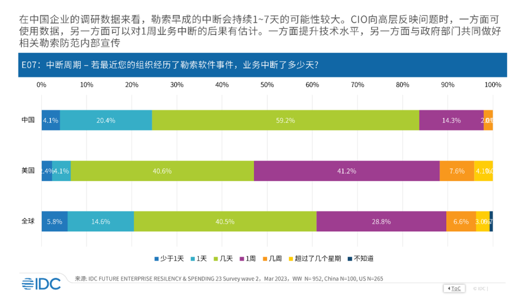 中国企业的调研数据来看,勒索造成的中断会持续1~7天的比例近80%,低于全球及美国水平。