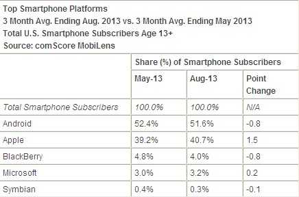 6月至8月,美国共1.45亿人拥有智能手机,移动市场渗透率为60.8%,环比上涨3%。苹果在美国占有率为40.7%,环比上升1.5个百分点,为第一大智能手机制造商。三星占24.3%,上升1.3个百分点,位居第二。其后依次为HTC(7.4%),摩托罗拉(6.9%)及LG(6.7%)。