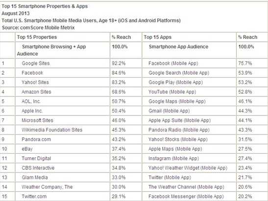 谷歌网站为最热门移动网站,移动用户覆盖率为92.2%,包括使用浏览器和应用的智能手机用户。其后依次为Facebook(84.6%),雅虎网站(83.2%),亚马逊网站(68.6%)。Facebook为最热门应用,覆盖率为75.7%。Google Search(53.9%),Google Play(53.2%),YouTube(52.8%),Google Maps(46.1%)及Gmail(44.3%)五个谷歌应用紧随其后。