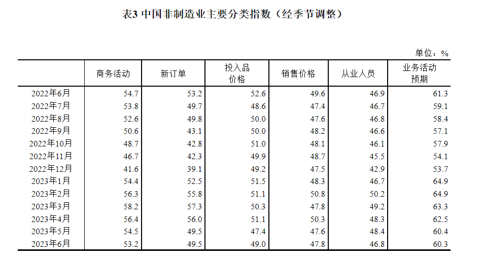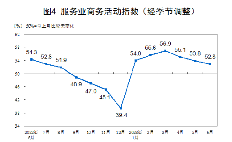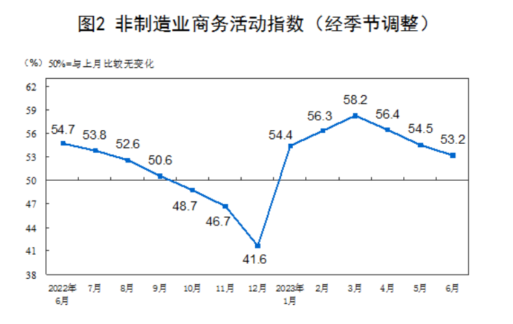 6月份,非制造业商务活动指数为53.2%,比上月下降1.3个百分点,仍高于临界点,非制造业今年以来始终保持扩张态势。