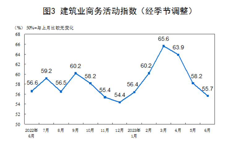分行业看,建筑业商务活动指数为55.7%,比上月下降2.5个百分点;服务业商务活动指数为52.8%,比上月下降1.0个百分点。从行业看,航空运输、邮政快递、电信广播电视及卫星传输服务、货币金融服务、保险等行业商务活动指数位于60.0%及以上高位景气区间;批发、房地产、居民服务等行业商务活动指数低于临界点。