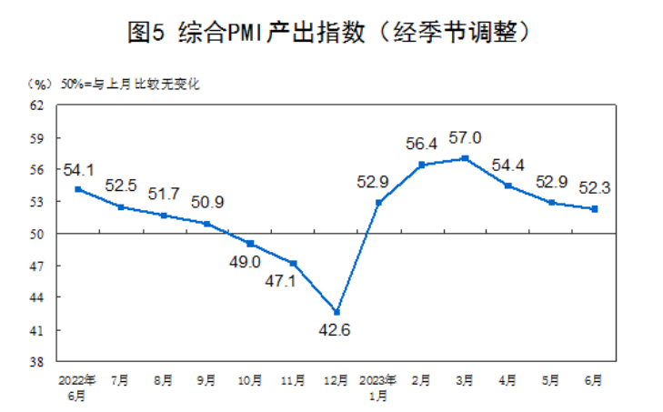 6月份,综合PMI产出指数为52.3%,比上月下降0.6个百分点,继续位于扩张区间,表明我国企业生产经营总体延续扩张态势。