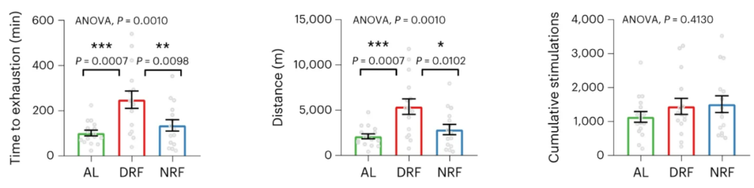 不跑不知道,一跑吓一跳。首先接受评估的“久坐小鼠”(sedentary mice)中,DRF组雌性小鼠的跑动距离和跑动时间,分别是NRF组和自由进食(AL)组小鼠的1.8倍和2.5倍,雄性小鼠中也观察到相似改变。而且NRF组和AL组小鼠日间自主活动及食量均无差异,说明跑步耐力改变与这些因素无关。