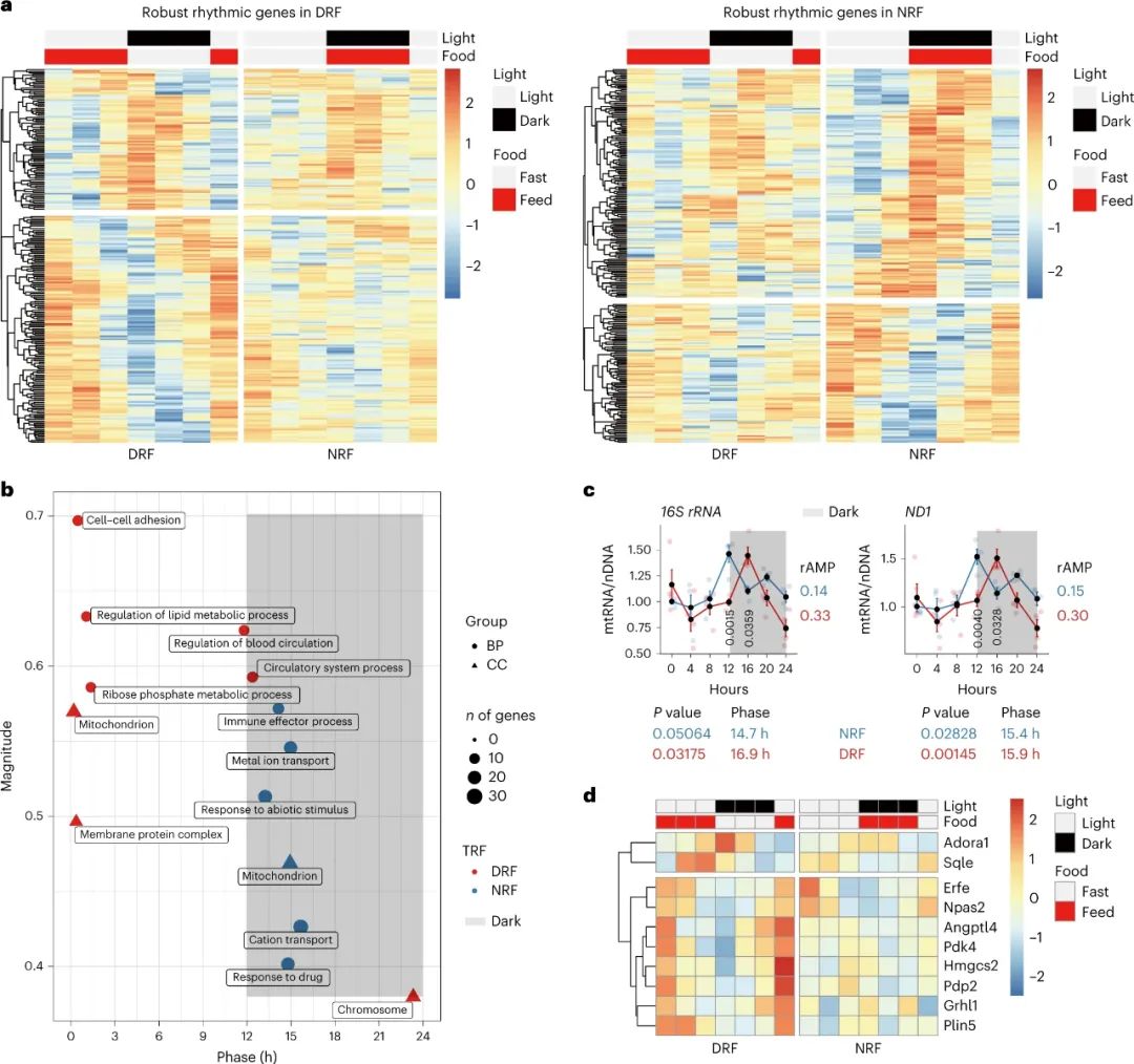 接下来就该分析代谢生物钟的作用了。实验显示,敲除关键生物钟基因Per1/Per2后,DRF即无法改善小鼠的跑步耐力;而DRF、NRF两种不同时段的断食,对代谢生物钟相关基因表达的影响也不同,例如与DRF时段高度同步的,主要是线粒体脂质代谢相关基因。