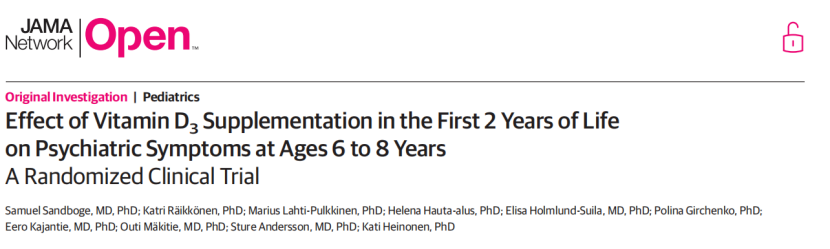 [1] Sandboge S, Räikkönen K, Lahti-Pulkkinen M, et al. Effect of Vitamin D3 Supplementation in the First 2 Years of Life on Psychiatric Symptoms at Ages 6 to 8 Years: A Randomized Clinical Trial[J]. JAMA Network Open, 2023, 6(5): e2314319-e2314319.