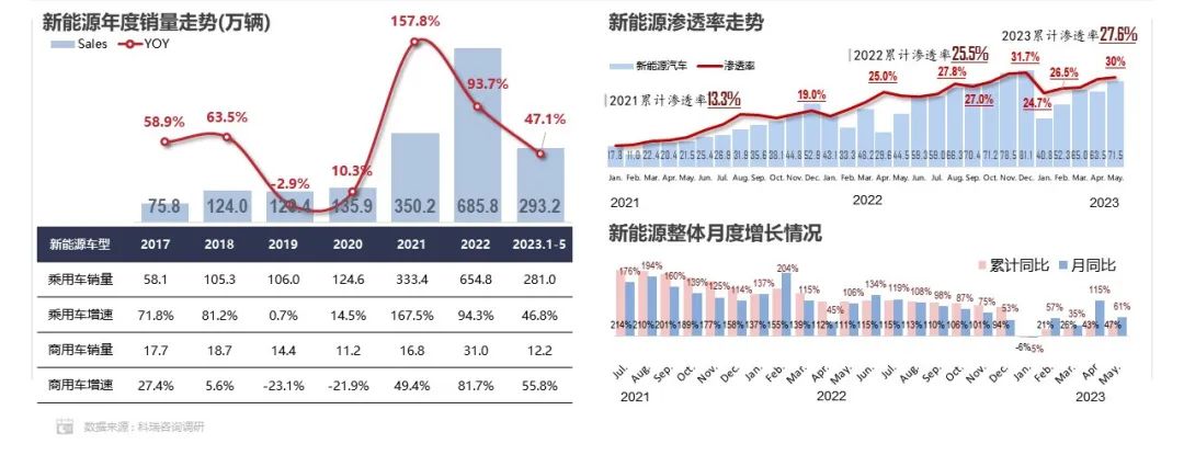 中国新能源汽车市场,2023年5月销售71.5万辆,环比增长12.6%,同比增长60.7%,渗透率达到 30%。其中乘用车销售68.9万辆,环比增长13.2%,商用车销售2.5万辆,环比下降3.3%,同比增长42.4%。5月中国新能源汽车市场,延续良好表现,市场渗透率稳步提升。