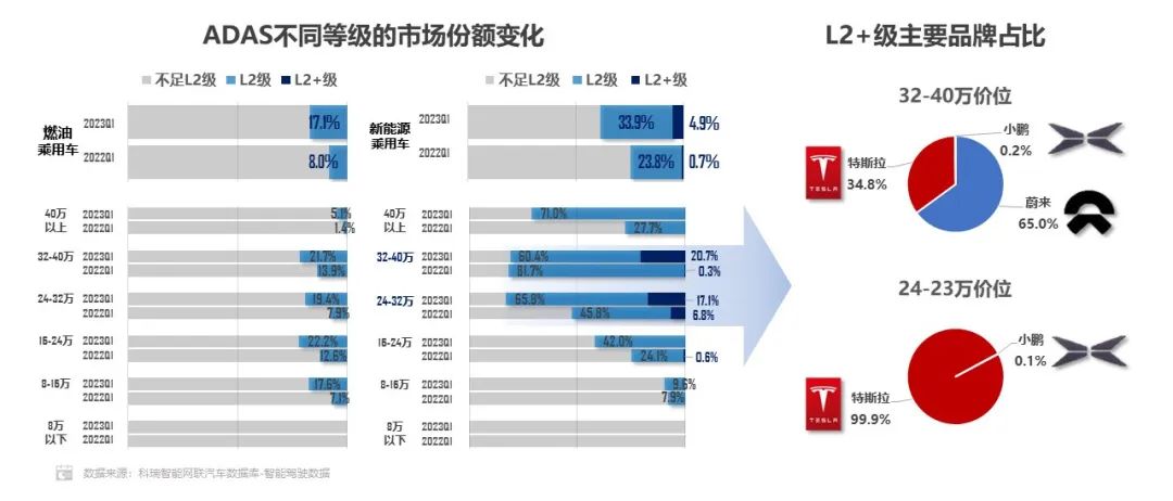 从装车比例上看,新能源乘用车在L2级以上的装车比例要显著高于燃油车型。在2023年1季度,新能源乘用车L2+级辅助驾驶的装车占比已经达到了4.9%,比去年同期高了4.2个百分点。燃油车方面还没有L2+级的车辆销售。从价位来看,24万以上价位的新能源乘用车,在2023年1季度有七成以上的车辆达到了L2级以上。各价位的增长势头都非常显著。而同价位的燃油车市场,L2级占比仅有两成左右。尽管增势也很明显,但与新能源市场差距仍然很大。