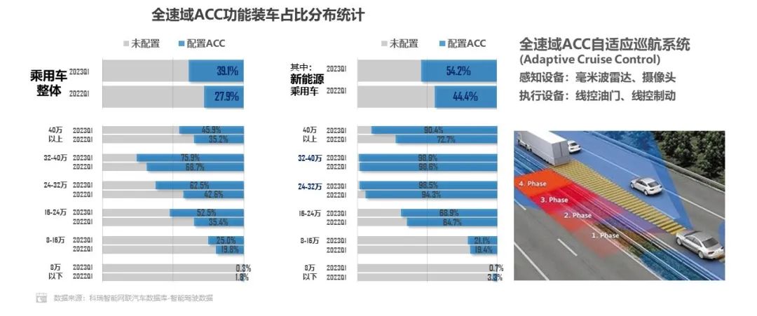 全速域ACC自适应巡航在今年一季度的装车占比达到了39%,其中新能源乘用车领域的装车占比更是达到了54%。与去年同期对比看,尽管乘用车各价位的装车占比都有明显的提高,但在新能源领域,同比增幅还是要显著小于市场整体水平。这与大部分新能源产品在去年上市初期就一步到位的配置了高阶辅助驾驶系统有关。目前24万以上的新能源乘用车基本完成了全速域ACC的普及,16-24万价位的装车率也接近了七成的水平。此技术的下阶段普及将转由燃油车推动。从当前势头看,16-32万燃油车的装车率提升幅度最大。