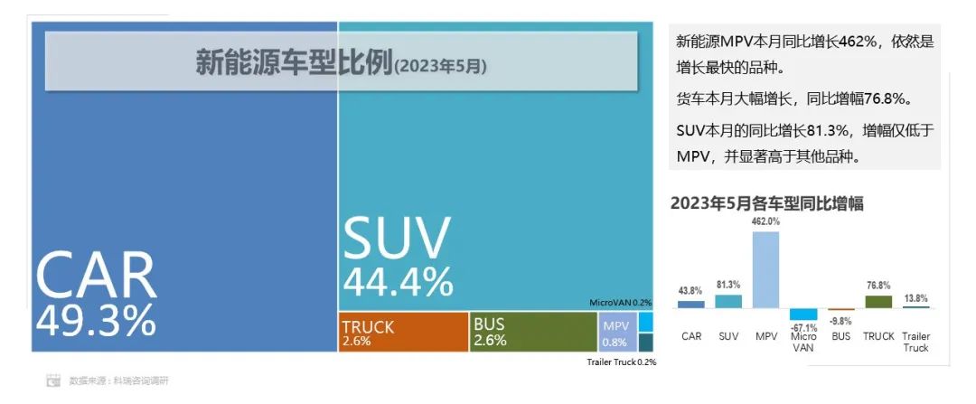 2023年5月,新能源轿车占新能源汽车整体的49.3%,比去年同期降低5.8个百分点;新能源SUV占比44.4%,同比增长5个百分点。新能源MPV和SUV同比增长明显,分别为462%和81.3%。新能源MPV本月同比增长462%,依然是增长最快的品种。货车本月大幅增长,同比增幅76.8%。SUV本月的同比增长81.3%,增幅仅低于MPV,并显著高于其他品种。