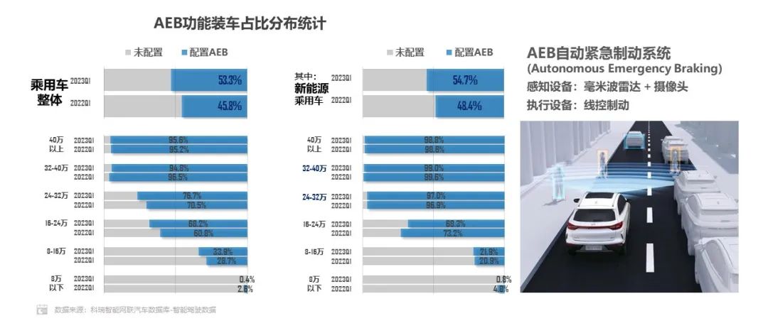 AEB自动紧急制动系统的普及情况非常好。32万元以上的乘用车基本上已经完成了AEB的普及。装车占比超过了九成。在新能源领域,AEB的普及价格甚至下移到了24万价位。在16-32万区间,AEB的普及趋势也非常明显,装车占比达到了六成以上。是市场非常欢迎的配置。在8-16万区间,由于新能源乘用车成本的压力,AEB的装车占比要落后于整体乘用车装车占比,仅有乘用车整体水平的2/3。在8万以下的市场区间,AEB的占比出现显著下降,2023一季度已经降至不足1%。
