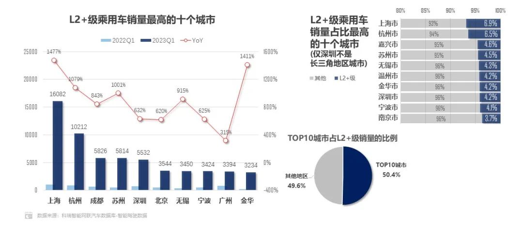 在地区分布上,L2+级的乘用车主要在江浙一代销售。L2+级占比最高前十位城市中,只有深圳不在江浙地区。从L2+级车辆的销量规模看,上海、杭州两市遥遥领先其他各地。成都、苏州和深圳在2023年1季度销量达到5000辆规模。排在6-10位的北京、无锡、宁波、广州、金华集中在3000辆的水平。目前前十位城市的销量总规模已经达到了全国的一半。市场需求非常的集中。