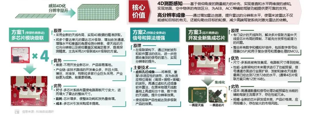 在4D化的同时,通过提升雷达的分辨率水平,使毫米波雷达不仅能感知目标的有无,还能勾勒出目标的轮廓,这使4D成像雷达可在一定程度上降低高端驾驶系统对激光雷达的依赖。而雷达分辨率的提升需要在天线设计和信号处理两方面同步增强。目前传统零部件巨头、芯片巨头、以及我国创新企业正在多路线推动产品的落地。
