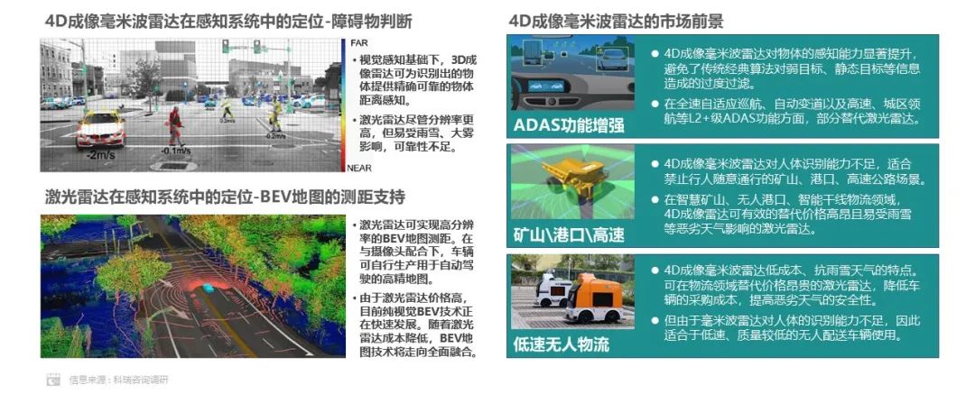 毫米波雷达感知距离远,并且环境适应能力强,可弥补摄像头在夜晚、雨雾天、逆光环境下性能不足的问题。同时,4D毫米波成像雷达与摄像头可形成互补感知方案,基本消除两者的短板。在精度要求不高的领域,可有效解决激光雷达成本高的问题。
