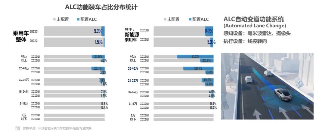 ALC自动变道功能在今年一季度的装车率显著要高于去年同期。配置率最高的市场区间是32万以上的新能源乘用车市场,其中40万以上价位的装车率已经突破六成,比去年同期提高了接近40个百分点。32-40万区间的装车率也达到了五成,比去年同期提高了37个百分点。尽管部分市场增长迅速,但乘用车整体的装车率仅有5.3%,其中新能源乘用车的装车率也仅有14%。由于ALC功能较为复杂,需要在产品中期改型或换代才能增加。该功能近期占比的增长将依赖全新车型的投放,因此短期不会出现明显的普及趋势。