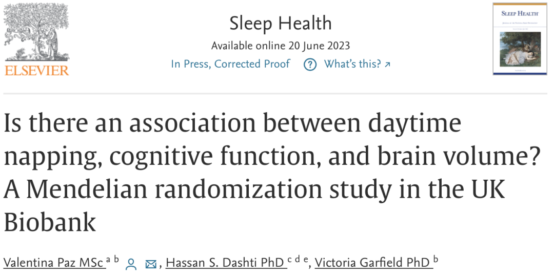 [3]Paz V, Dashti HS, Garfield V. Is there an association between daytime napping, cognitive function, and brain volume? A Mendelian randomization study in the UK Biobank. Sleep Health. 2023 Jun 12:S2352-7218(23)00089-X. doi: 10.1016/j.sleh.2023.05.002. Epub ahead of print. PMID: 37344293.