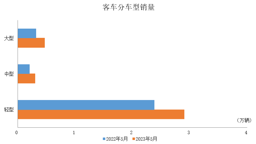 2023 年 5 月,客车产销环比均有所下降,同比均快速增长。在客车细分品种中,与上月相比,轻型客车产销下降,大型客车和中型客车产销呈不同程度增长;与上年同期相比,三大类客车品种产销均呈明显增长。