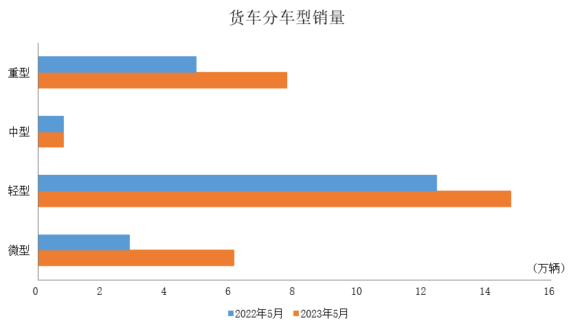 2023 年 1-5 月,货车产销同比均有所增长。在货车主要品种中,与上年同期相比,中型货车产销小幅下降,其余三大类货车品种产销呈不同程度增长。