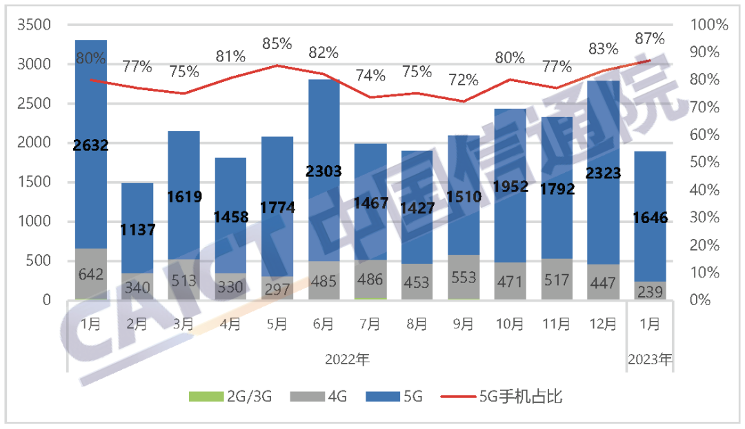 2023年1月,国内市场手机出货量1890.2万部,同比下降42.8%,其中,5G手机1645.6万部,同比下降37.5%,占同期手机出货量的87.1%。