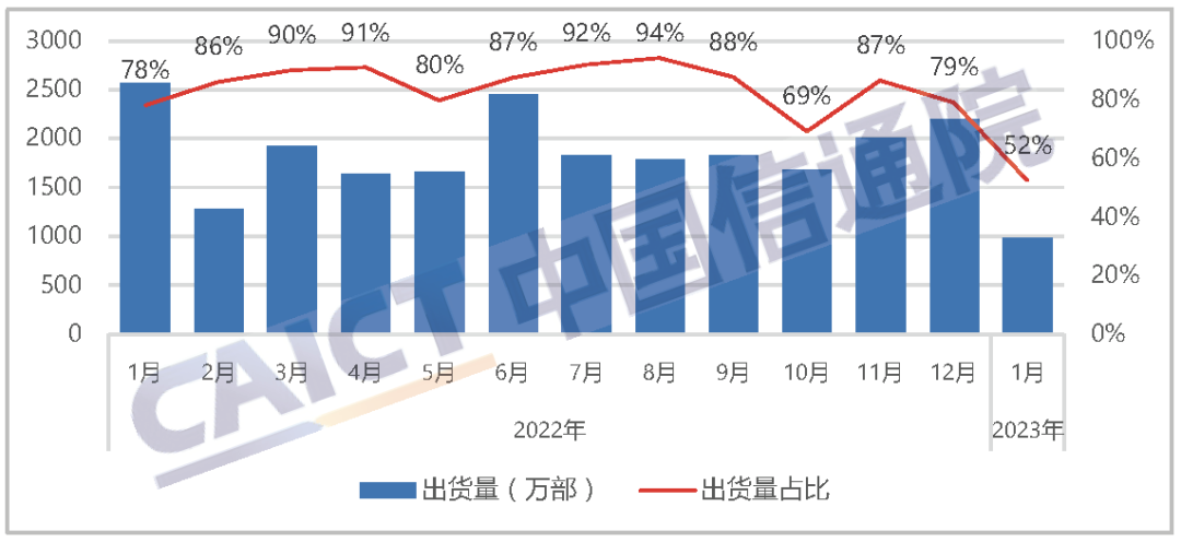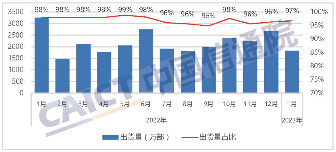 2023年1月,智能手机出货量1829.1万部,同比下降43.6%,占同期手机出货量的96.8%。