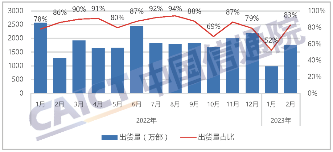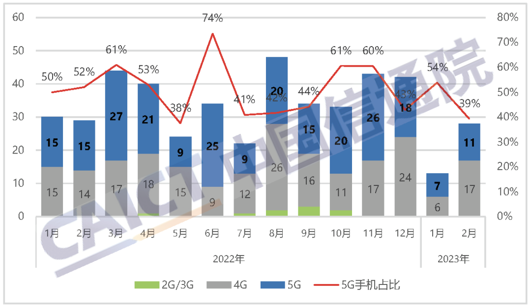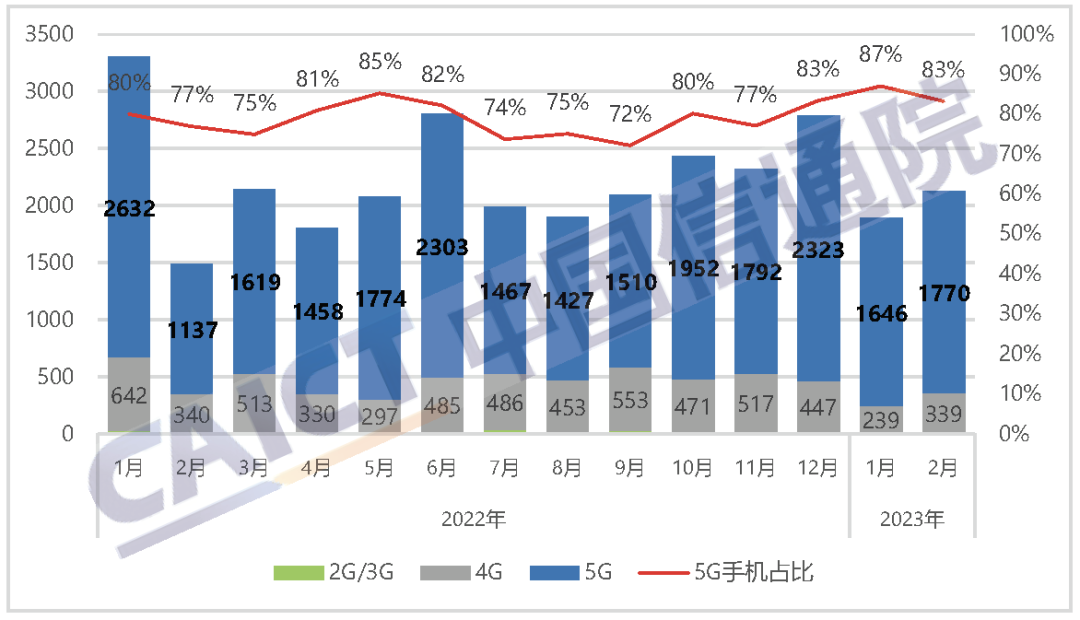 2023 年 2 月,国内市场手机出货量 2126.0 万部,同比增长 43.0%,其中,5G 手机 1770.4 万部,同比增长 55.7%,占同期手机出货量的 83.3%。