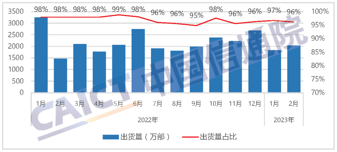 2023 年 2 月,智能手机出货量 2043.6 万部,同比增长 39.6%,占同期手机出货量的 96.1%。2023 年 1-2 月,智能手机出货量 3872.6 万部,同比下降 17.7 %,占同期手机出货量的 96.4%。