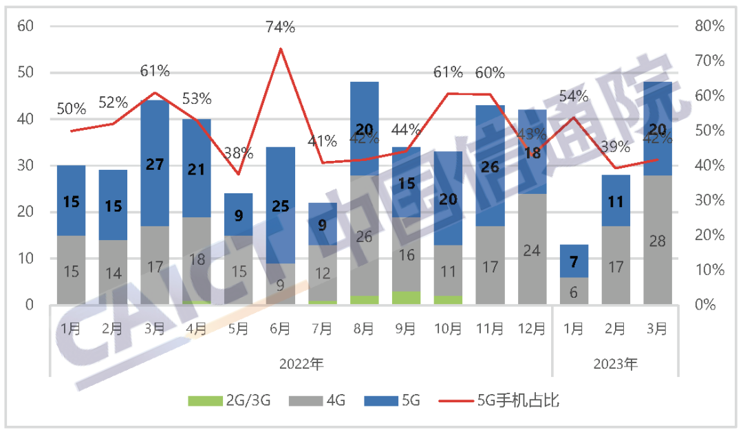 2023年3月,国内手机上市新机型48款,同比增长9.1%,其中5G手机20款,同比下降25.9%,占同期手机上市新机型数量的41.7%。