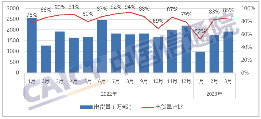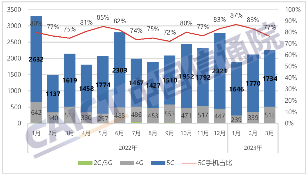 2023年3月,国内市场手机出货量2261.5万部,同比增长5.4%,其中,5G手机1734.2万部,同比增长7.1%,占同期手机出货量的76.7%。