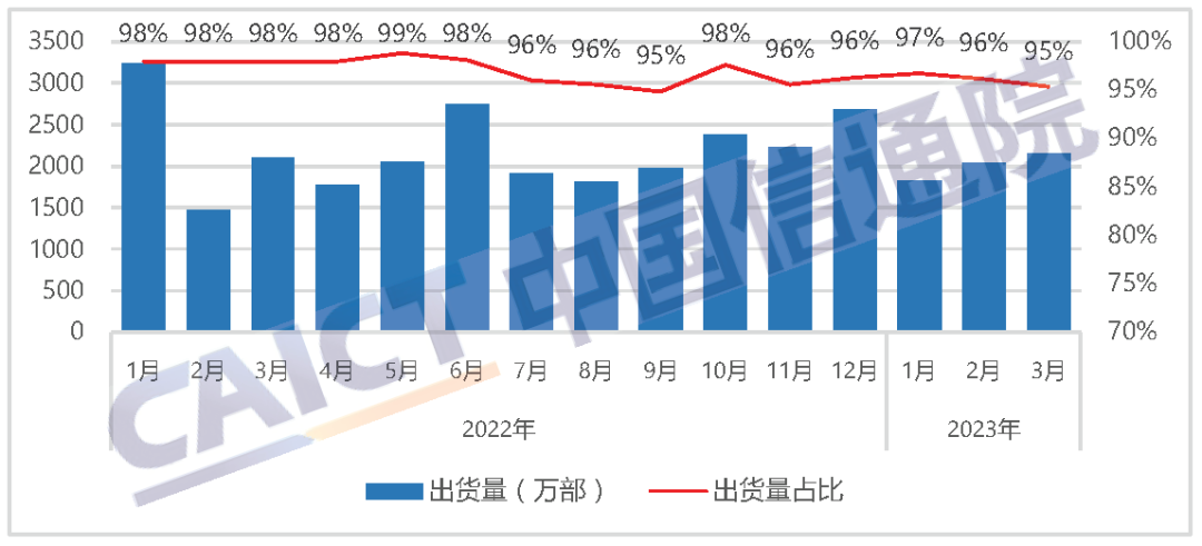 2023年3月,智能手机出货量2155.9万部,同比增长2.5%,占同期手机出货量的95.3%。2023年1-3月,智能手机出货量6028.5万部,同比下降11.5 %,占同期手机出货量的96.0%。