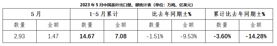 截至5月,2023年中国茶叶累计出口量为14.67万吨,同比减少3.60%,累计出口额为7.08亿美元,同比减少14.28%,1-5月出口均价为美元/千克,比去年同期下降11.07%。