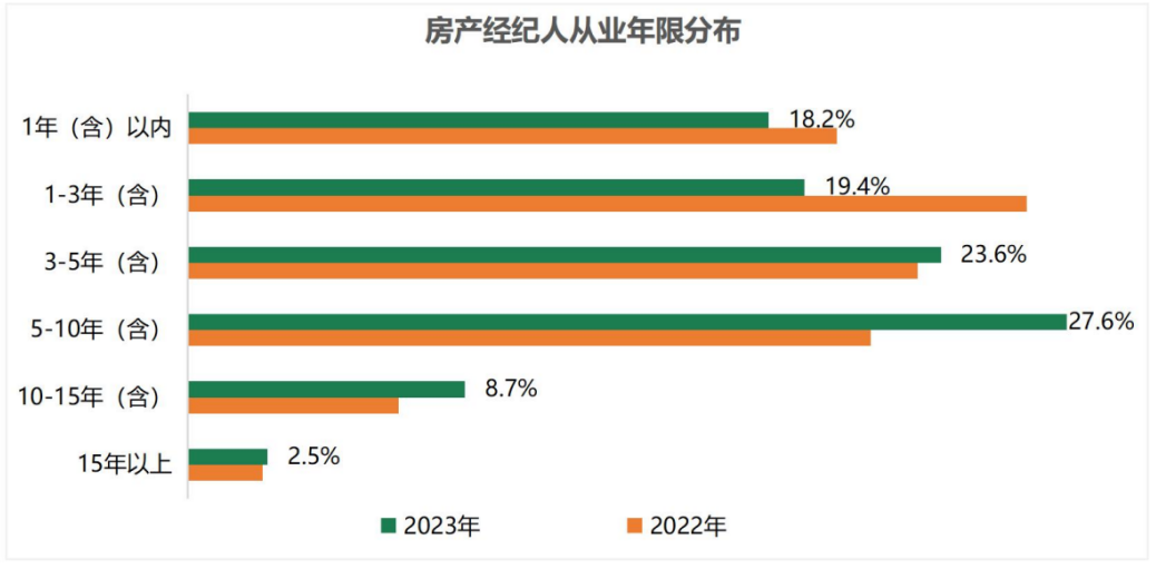 从近两年调研数据可以看出,从业时间在 3 年以上的房产经纪人占比逐年增加,合计占比已经超过六成。其中,2023 年参与调研的经纪人中,从业 5-10 年的房产经纪人占比增长超过 6 个百分点,10-15 年的增长 2 个百分点。反之,从业年限 3 年及以下的经纪人占比下降至不足三成,而这一比例在 2021 年接近七成。