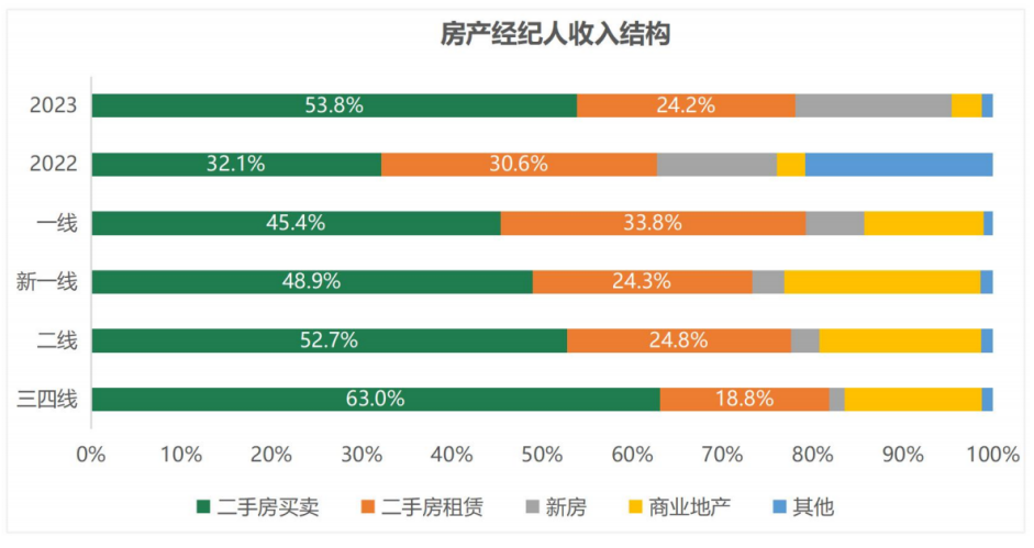 疫情过后,随着房产经纪业务回到正轨,二手房买卖业务收入占比重新成为房地产经纪人的主要收入来源,占比 53.8%,二手房租赁业务的收入占比约 24.2%,基本上恢复到疫情前的水平。