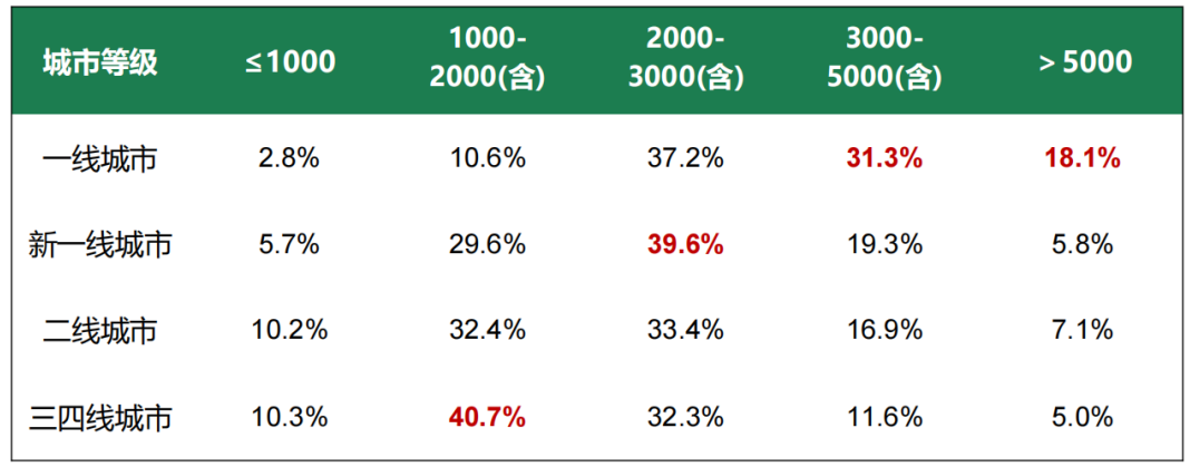根据调研结果,房产经纪人底薪范围集中在 1000 到 3000 元/月之间。约有 36% 的经纪人底薪范围在 2000-3000 元/月。一线城市底薪最高,有近半数经纪人底薪在 3000 元/月之上。但总体而言,房产经纪人底薪收入不高,因此我们可以看到,在经纪人市场信心增强的情况下,对于薪资的期望也有变化。
