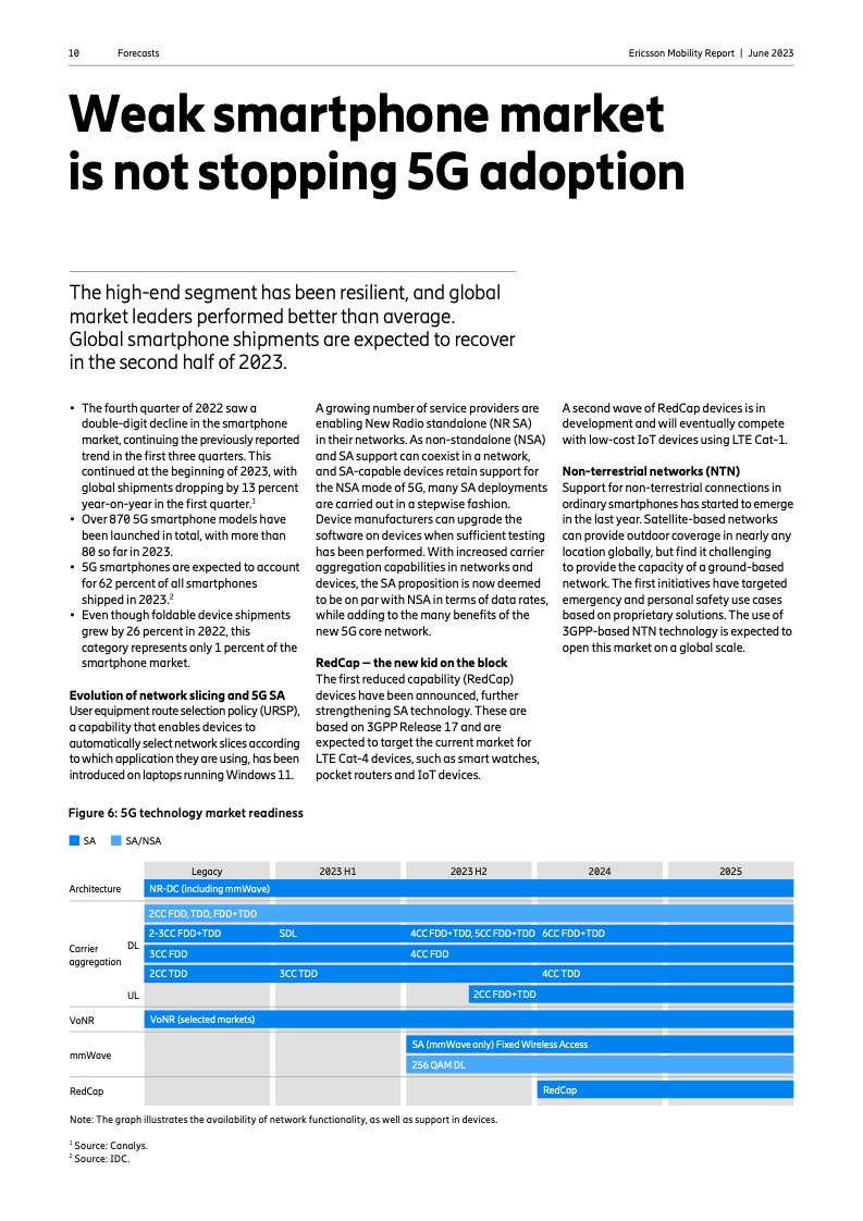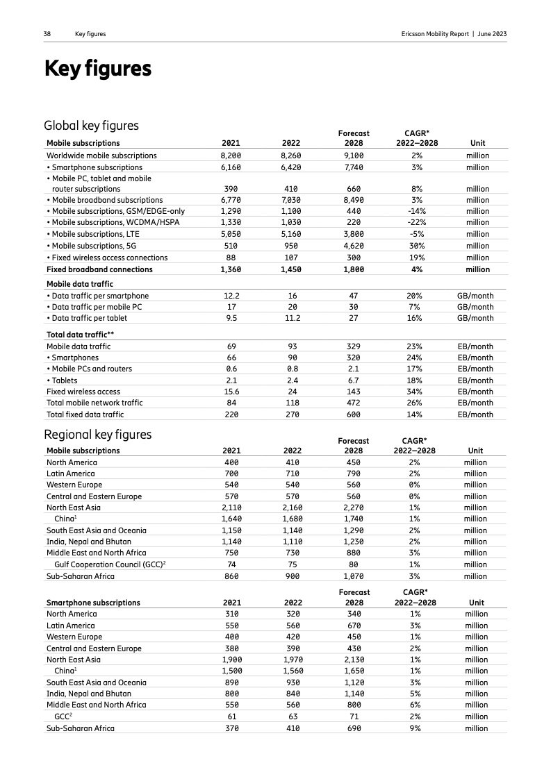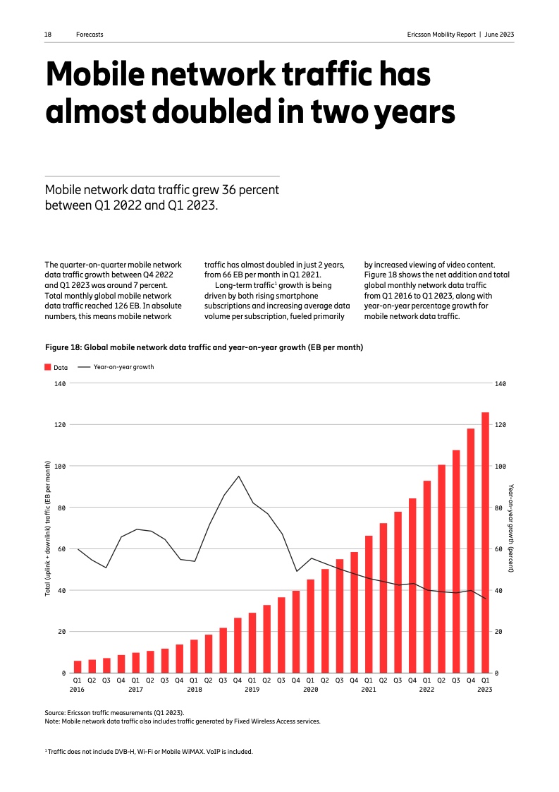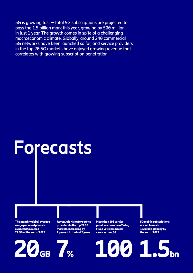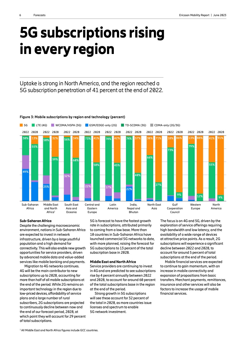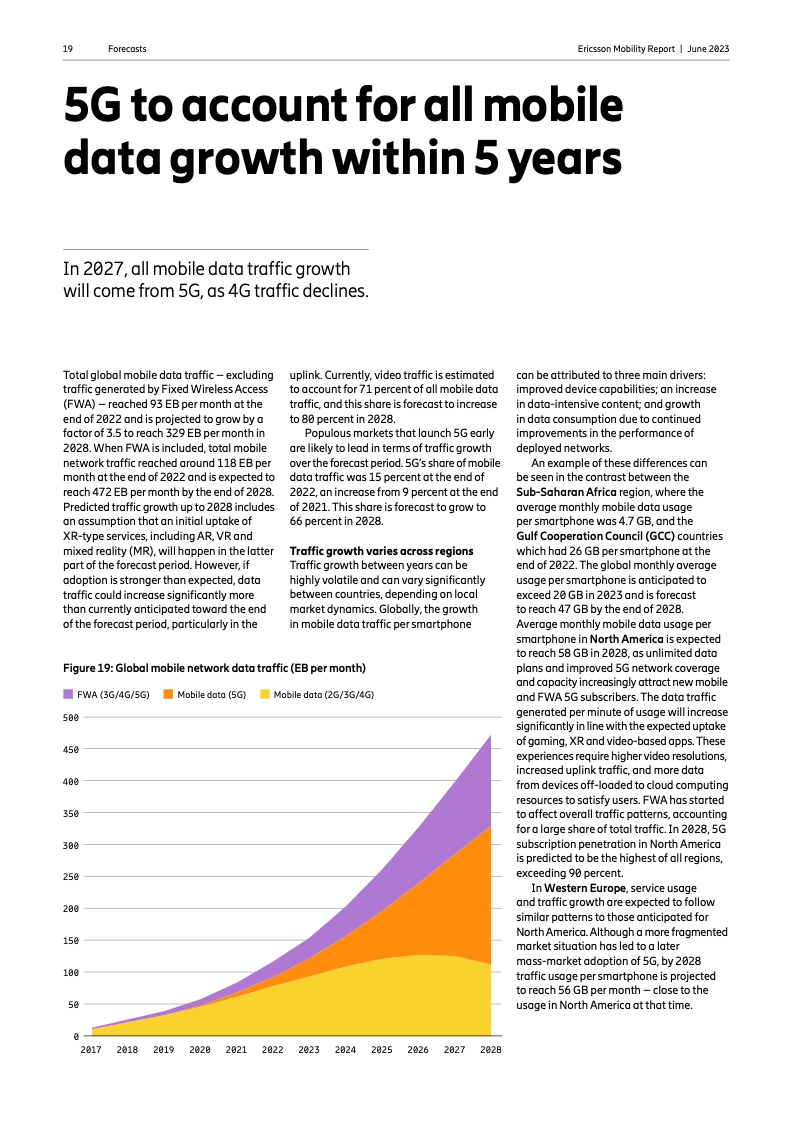 尽管一些市场存在地缘政治挑战和宏观经济放缓,但从根本上说,全球每个地区的5G用户都在增长。全球移动网络数据流量继续增长,预计到2023年底,全球每部智能手机的月平均使用量将超过20GB。