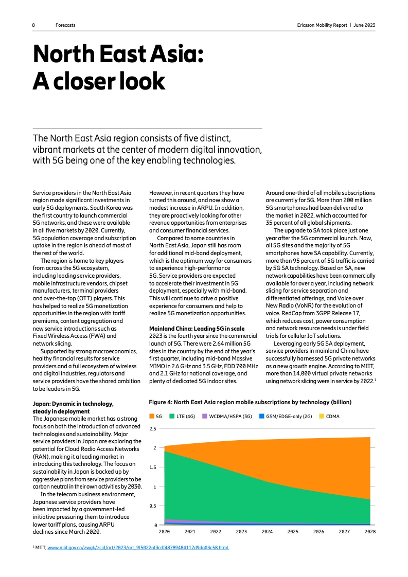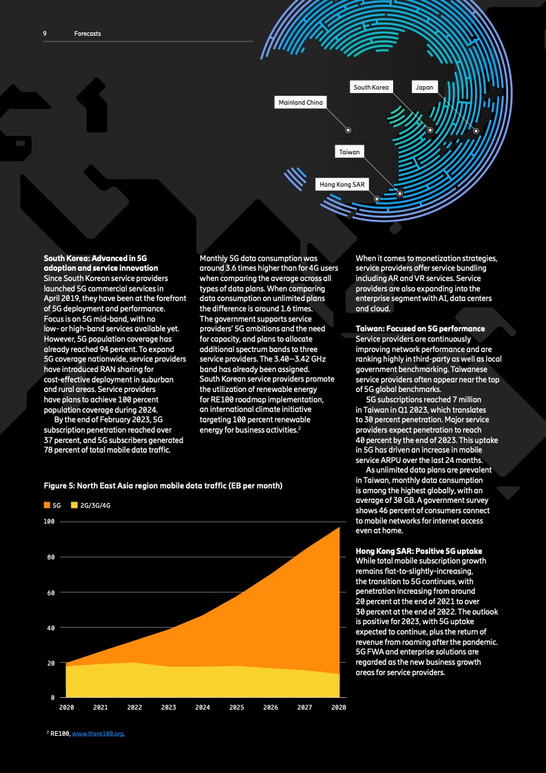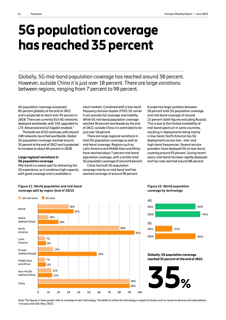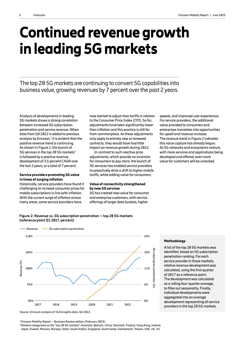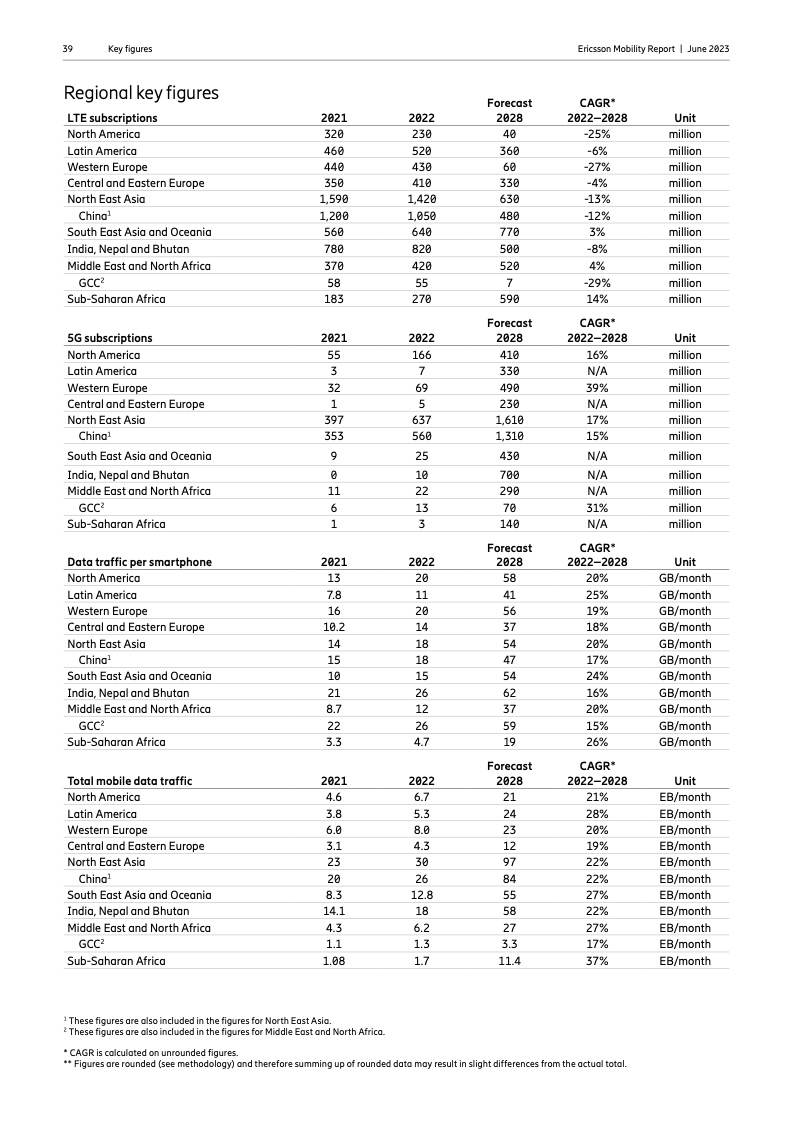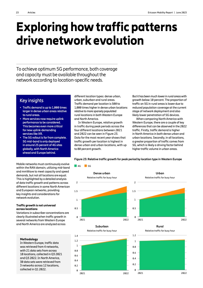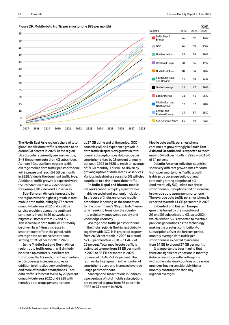 尽管一些市场存在地缘政治挑战和宏观经济放缓,但从根本上说,全球每个地区的5G用户都在增长。全球移动网络数据流量继续增长,预计到2023年底,全球每部智能手机的月平均使用量将超过20GB。