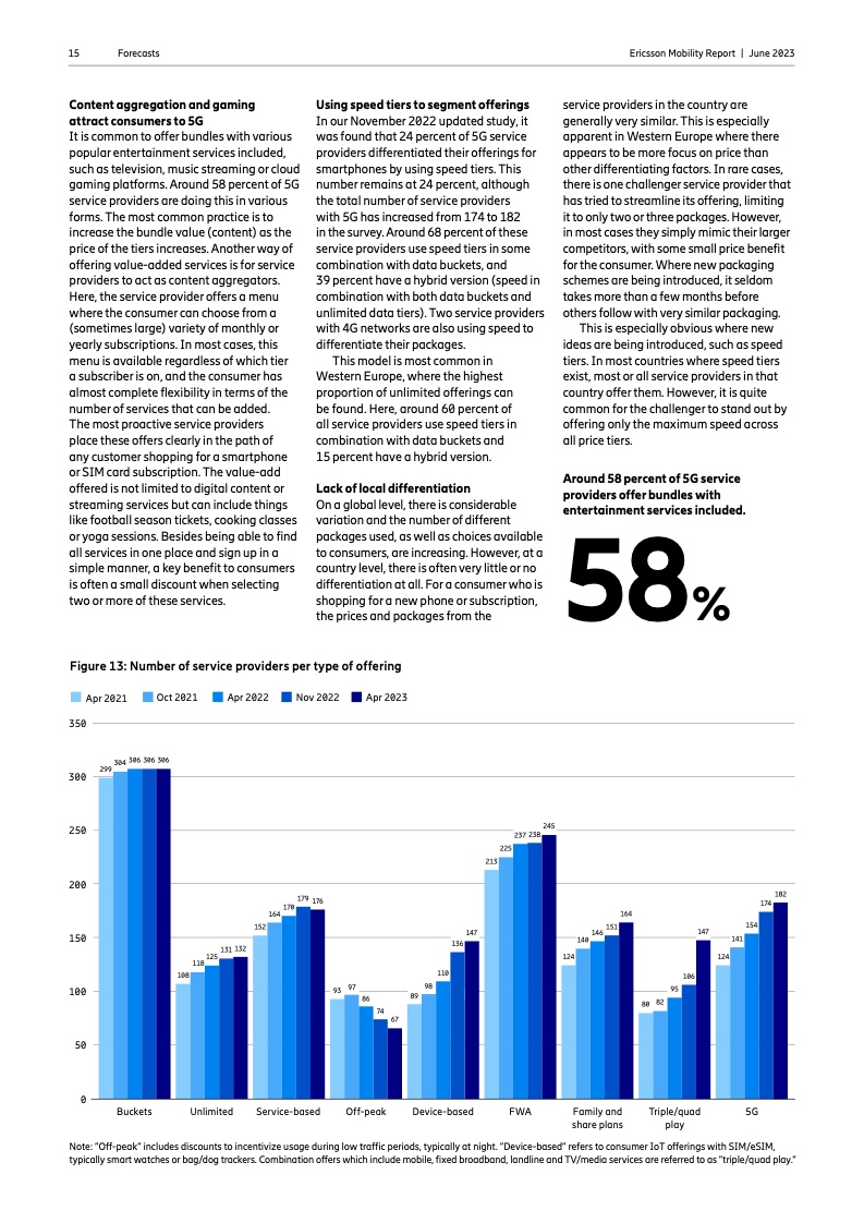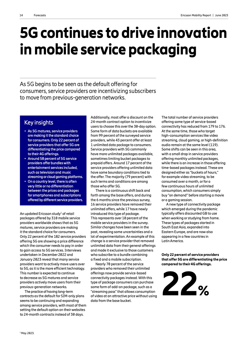 5G也在推动移动服务包装的创新。在CSP中,提供包括电视在内的各种流行娱乐服务的捆绑服务越来越普遍。目前,约58%的5G服务提供商以各种形式开展这项业务。