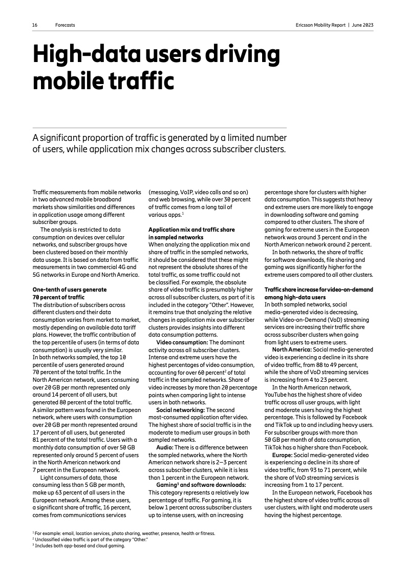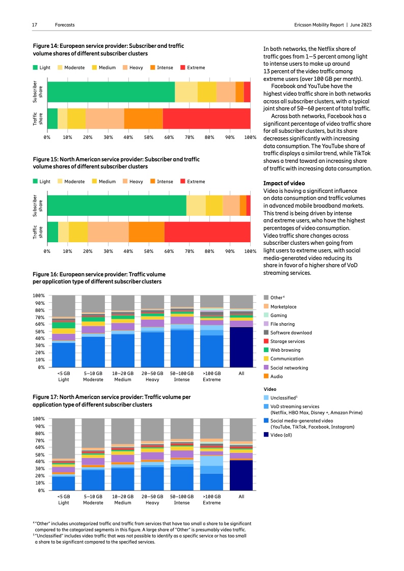 总而言之,视频对先进移动宽带市场的数据消费和流量产生了重大影响。这一趋势是由强烈和重度用户推动的,他们视频消费比例最高。当从轻度用户到重度用户时,视频流量份额在用户群中发生了变化,社交媒体产生的视频份额减少,而VOD流媒体服务的份额增加。
