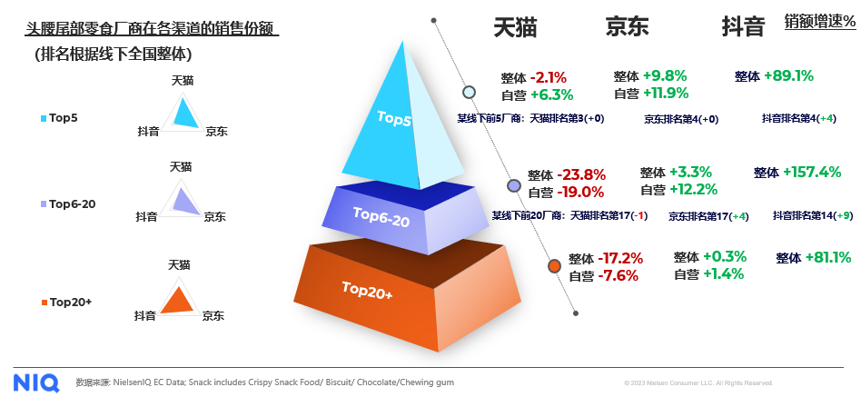 对不同的电商渠道以及厂商而言,头部零食厂商依旧依赖传统电商平台如天猫,腰部零食厂商在京东、天猫都有发展,并在京东成长更快,而尾部零食厂商则更依赖于抖音电商平台。而对所有级别的厂商而言,抖音都将成为零食厂商进行内容营销,吸引消费者种草购买的重要阵地。零食厂商也应该根据自身情况以及定位,决定在不同的电商渠道进行营销投放。