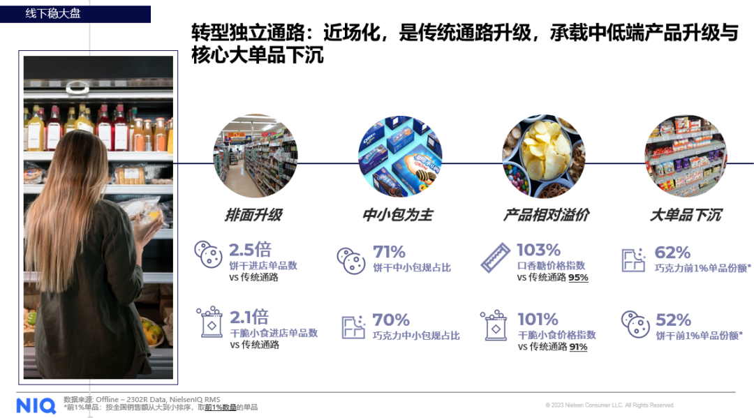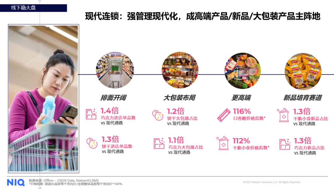 尼尔森IQ监测数据进一步显示,34%的零食品类销售额来自于现代连锁店。现代连锁店强调现代化管理,具备面积大、O2O赋能,供应链规模优势、强体验等一系列特征。而良好的购物体验以及优质而丰富的商品选择使得消费者愿意为现代连锁店内销售的产品支付较高溢价,因此现代连锁店成为大包装产品、高端产品及新品的主攻阵地。