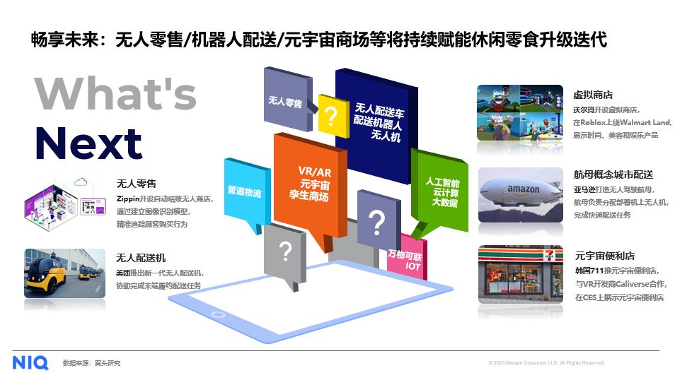 对于零食企业而言,未来无人零售、机器人配送、元宇宙商场等将持续赋能休闲零食的迭代升级。零食企业在布局O2O,跑赢即时零售的同时,还应将眼光放长远,早日布局新兴领域,利用新科技与概念,采纳更多年轻人喜欢的渠道形式,制定相应的产品策略与渠道策略。