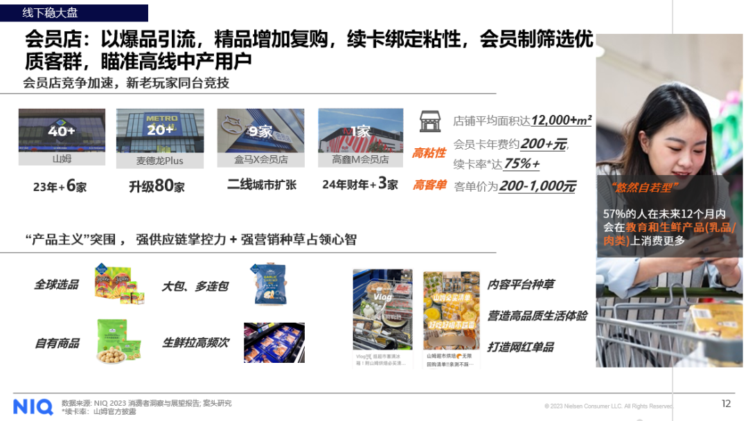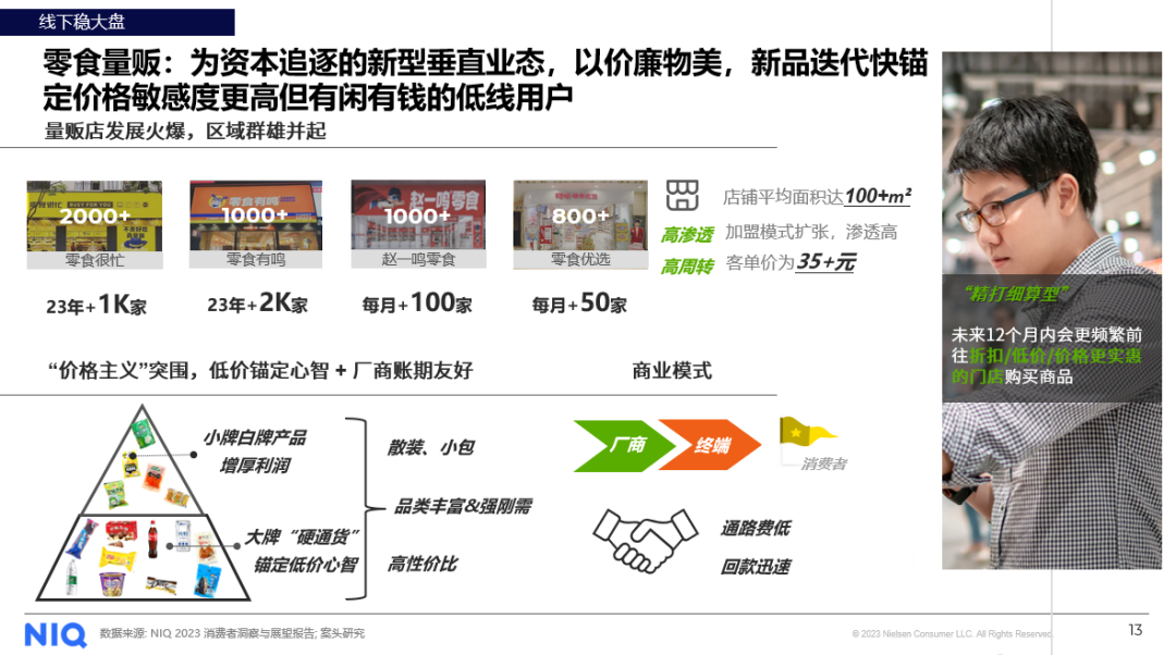 疫情过后,线下渠道的重要性逐步恢复。根据尼尔森IQ线下渠道监测数据,2023年迄今,线下渠道占据70.3%的消费品全渠道份额,而2022全年线下渠道占比为65.4%。对渠道进一步细分,尼尔森IQ发现大超市,小超市和便利店等连锁门店增长迅速,均呈现双位数增长。