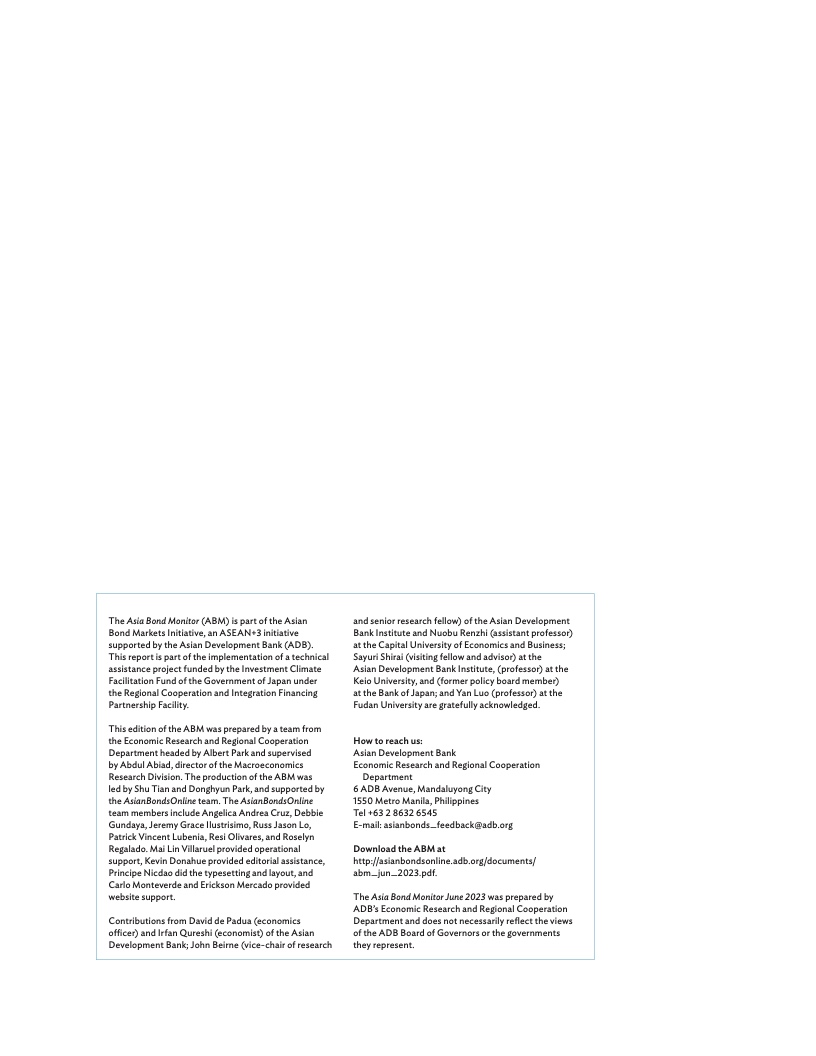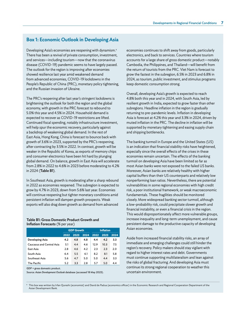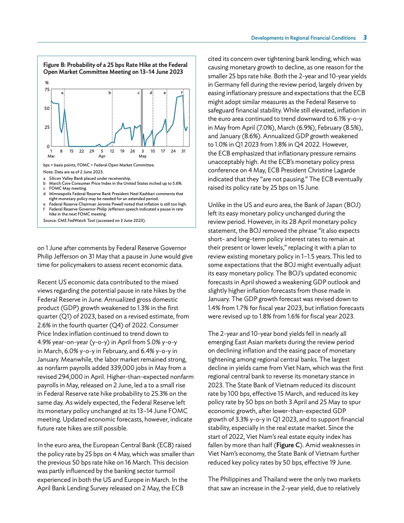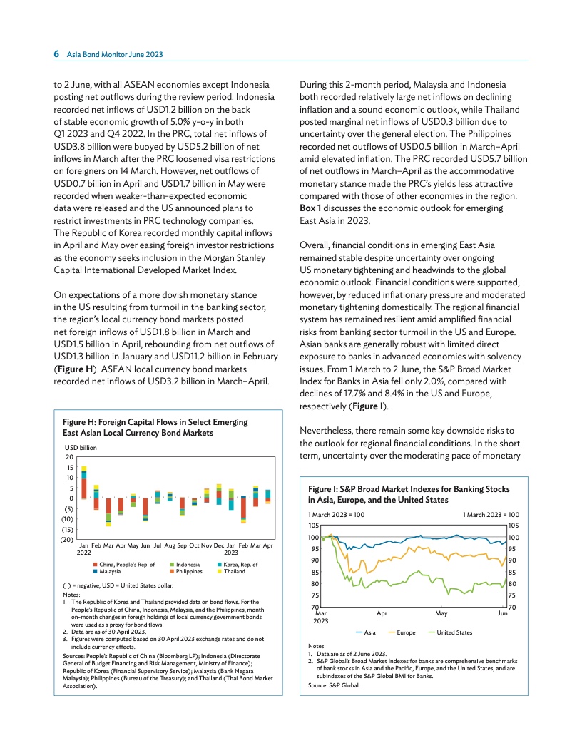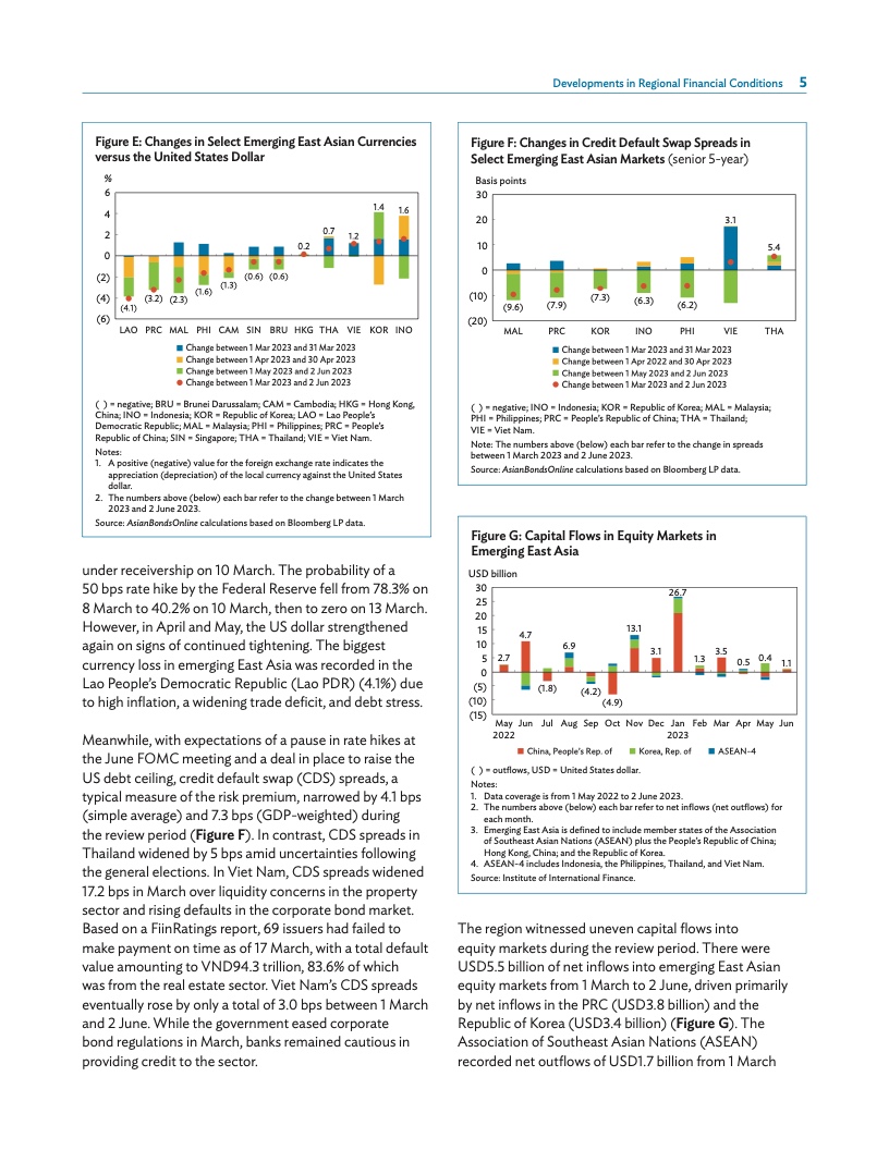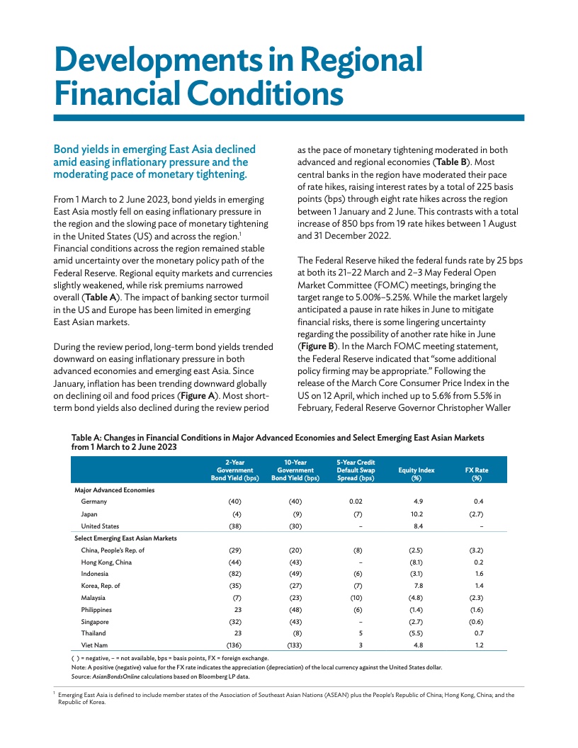 尽管美联储的货币政策立场仍存在不确定性,加之主要发达经济体的银行业面临风险,但东亚地区的金融状况基本保持稳定。自3月1日至6月2日期间,权益市场下跌,本币对美元汇率小幅走弱,风险溢价收窄。