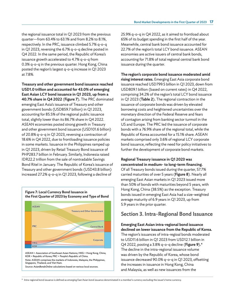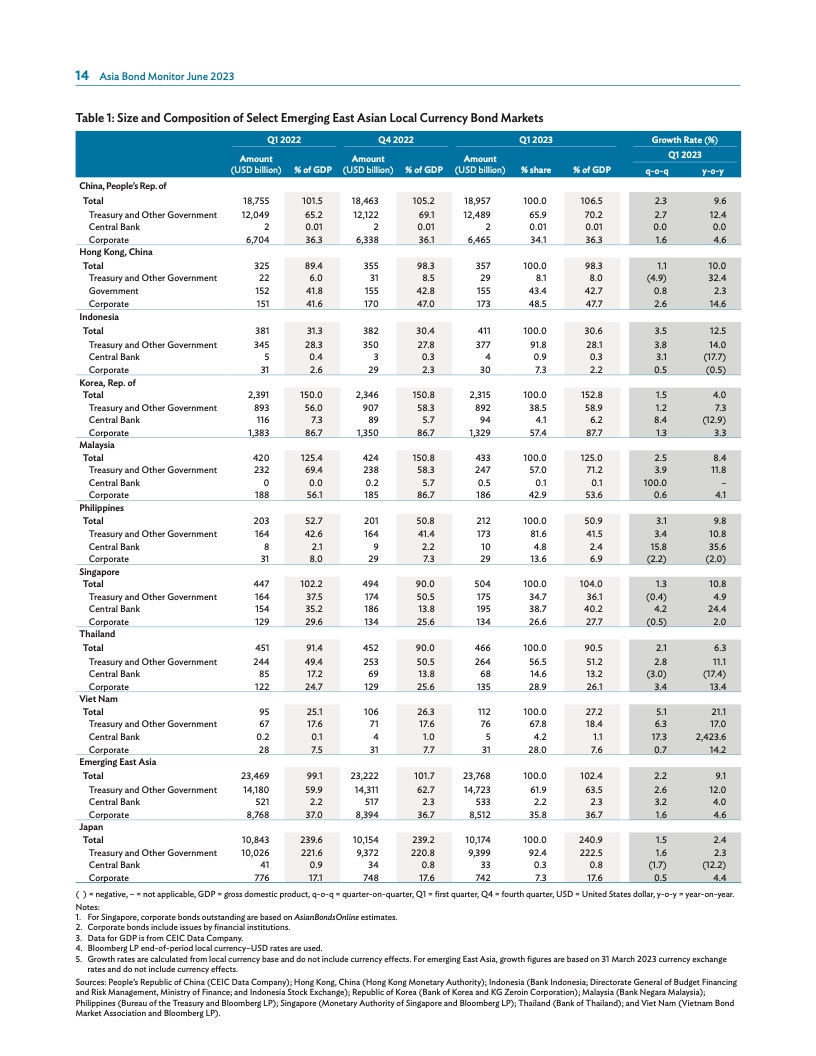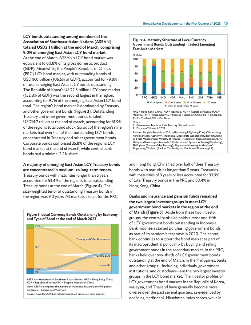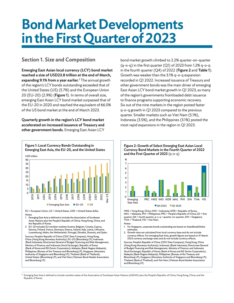中国本币债券市场依然是东亚新兴经济体中规模最大的市场,截至2023年3月,该市场的存量债券余额占该地区总量的79.8%。在今年度地方政府债券额度提前下达的情况下,国债和其他政府债券的推动使得市场规模较上一季度增长了2.3%,达到了19万亿美元。