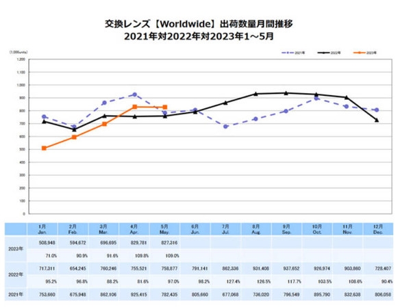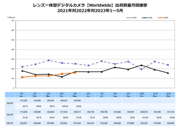 首先,在2023年5月,数码相机总出货量为2022年5月份的111.1%(按交易额计算为111.3%),没有4月那么强劲,但按单位单位和价值计算仍高于去年同月。