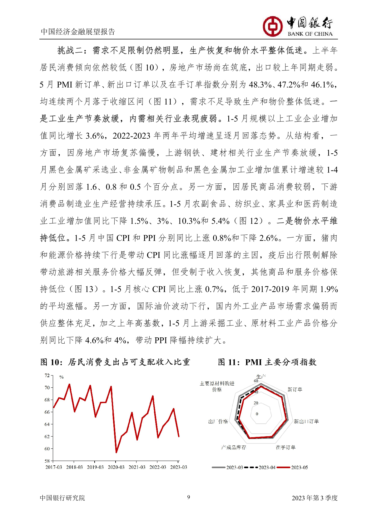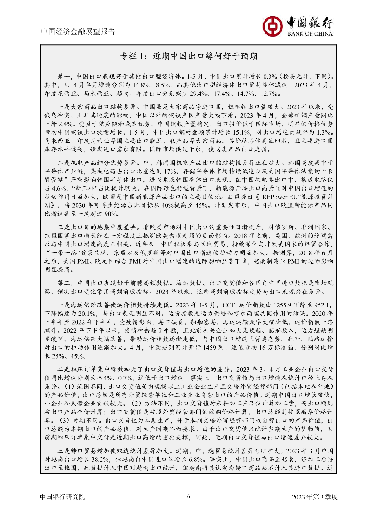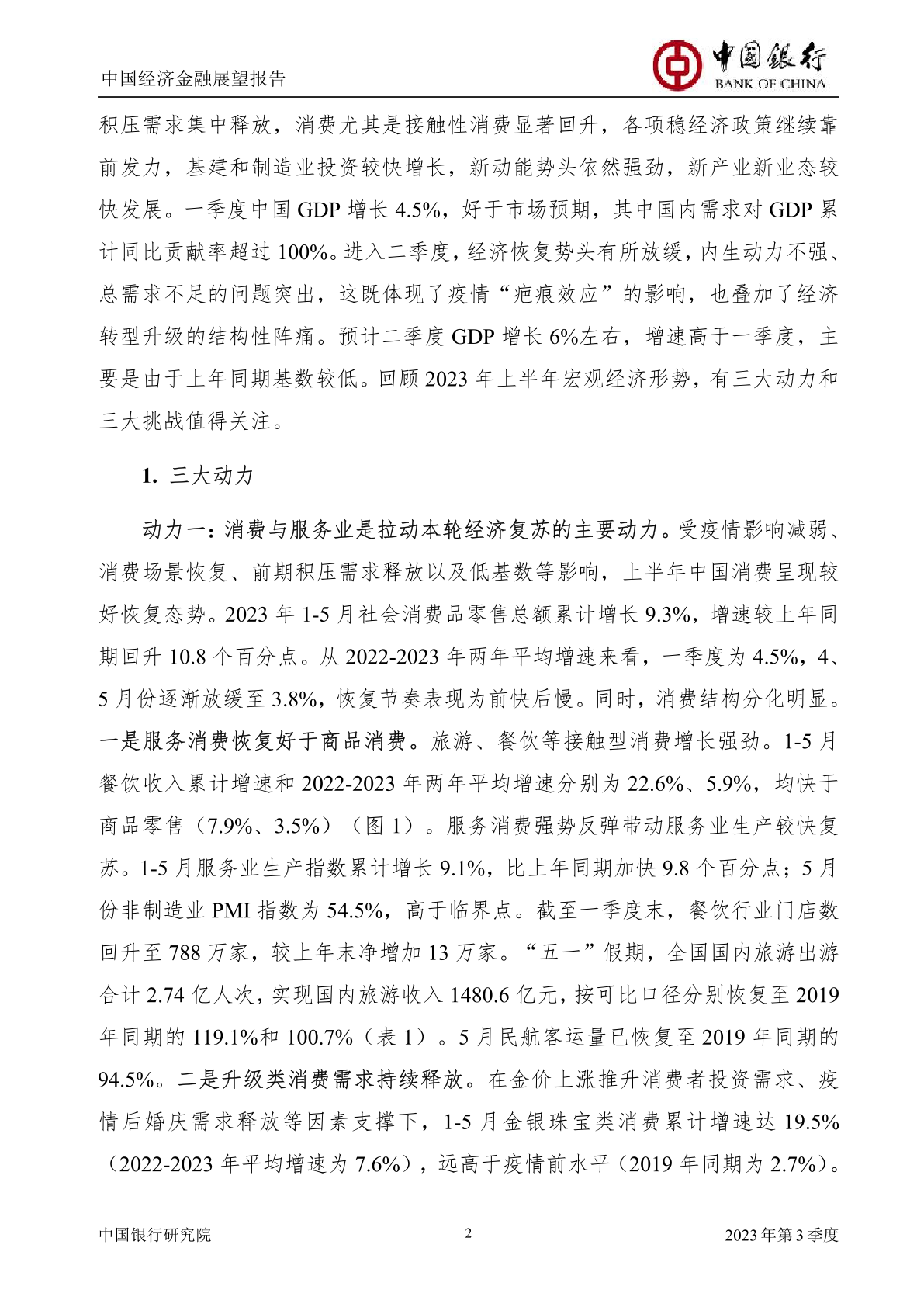 2023 年上半年,中国国内疫情影响明显消退,需求收缩、 供给冲击、预期转弱三重压力缓解,国内需求对经济增 长的贡献提高,一季度中国 GDP 增长 4.5%,好于市场 预期。进入二季度,经济恢复势头有所放缓,内生动力 不强、需求不足的问题突出,预计二季度 GDP 增长 6% 左右,其增速高于一季度,主要是由于上年同期基数较 低。