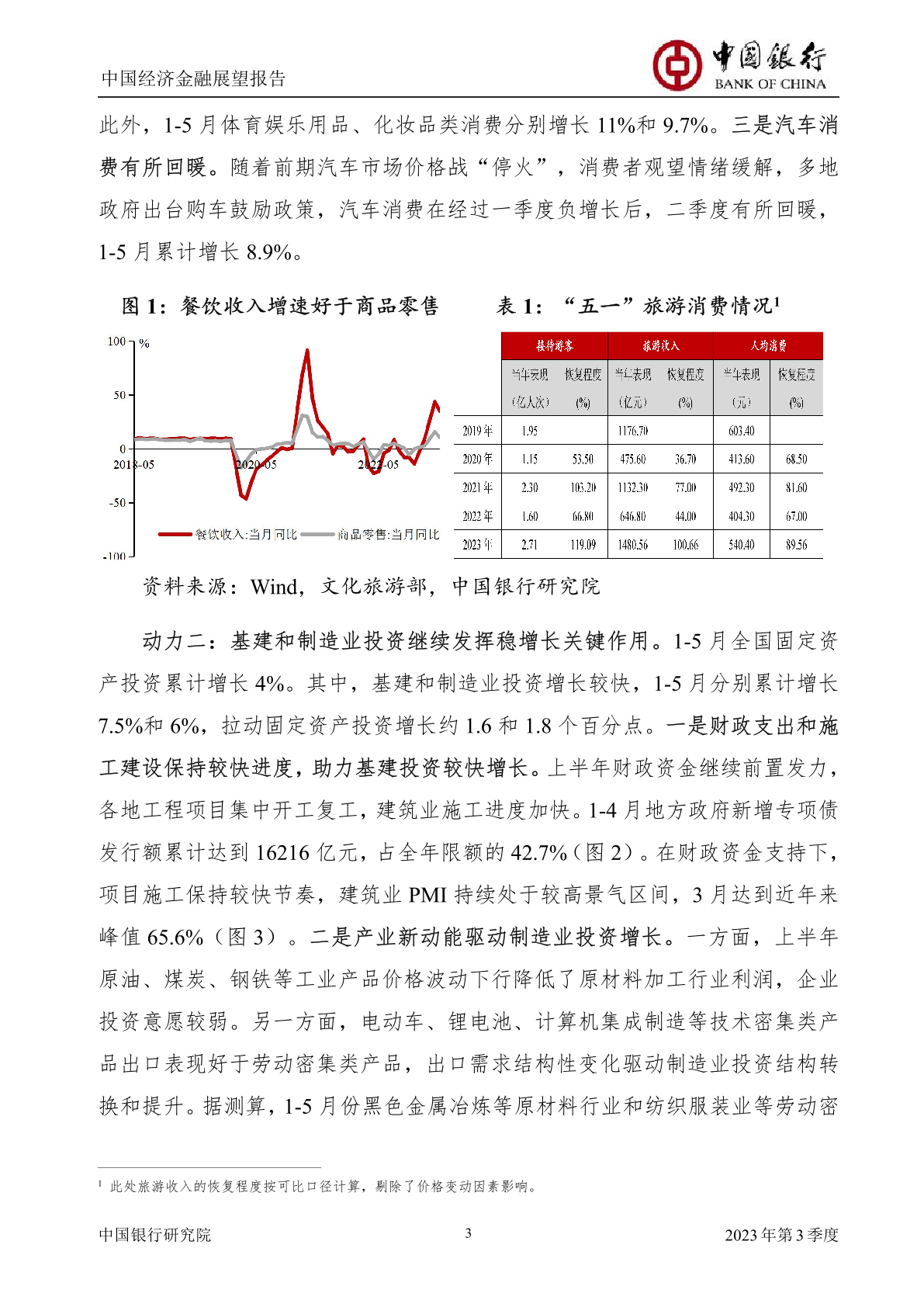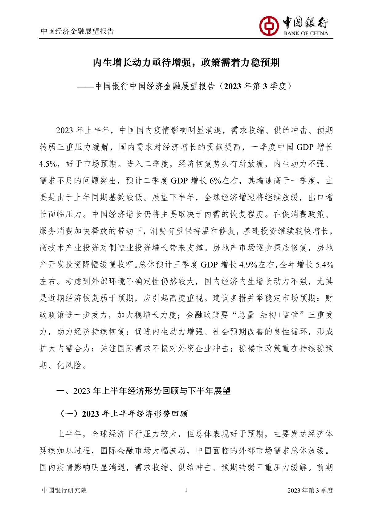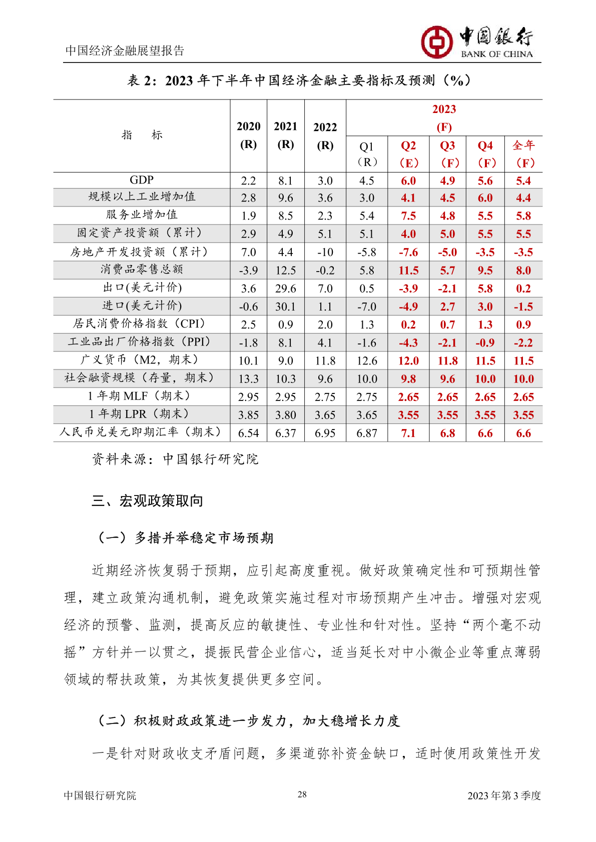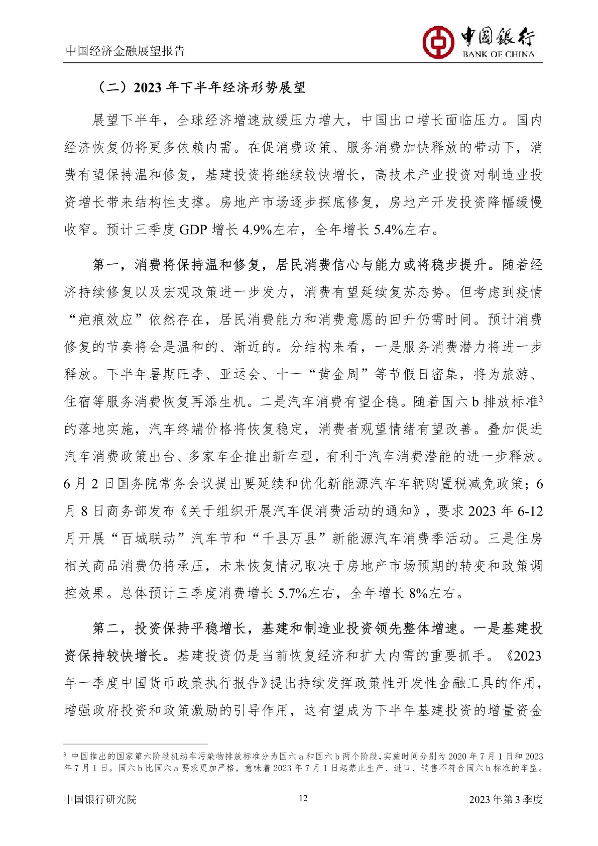 展望下半年,中国经济增长仍将主要取决于内需的恢复 程度。在促消费政策、服务消费加快释放的带动下,消 费有望保持温和修复,基建投资将继续较快增长,高技 术产业投资对制造业投资增长带来支撑,房地产市场逐 步探底修复。总体预计三季度 GDP 增长 4.9%左右,全 年增长 5.4%左右。