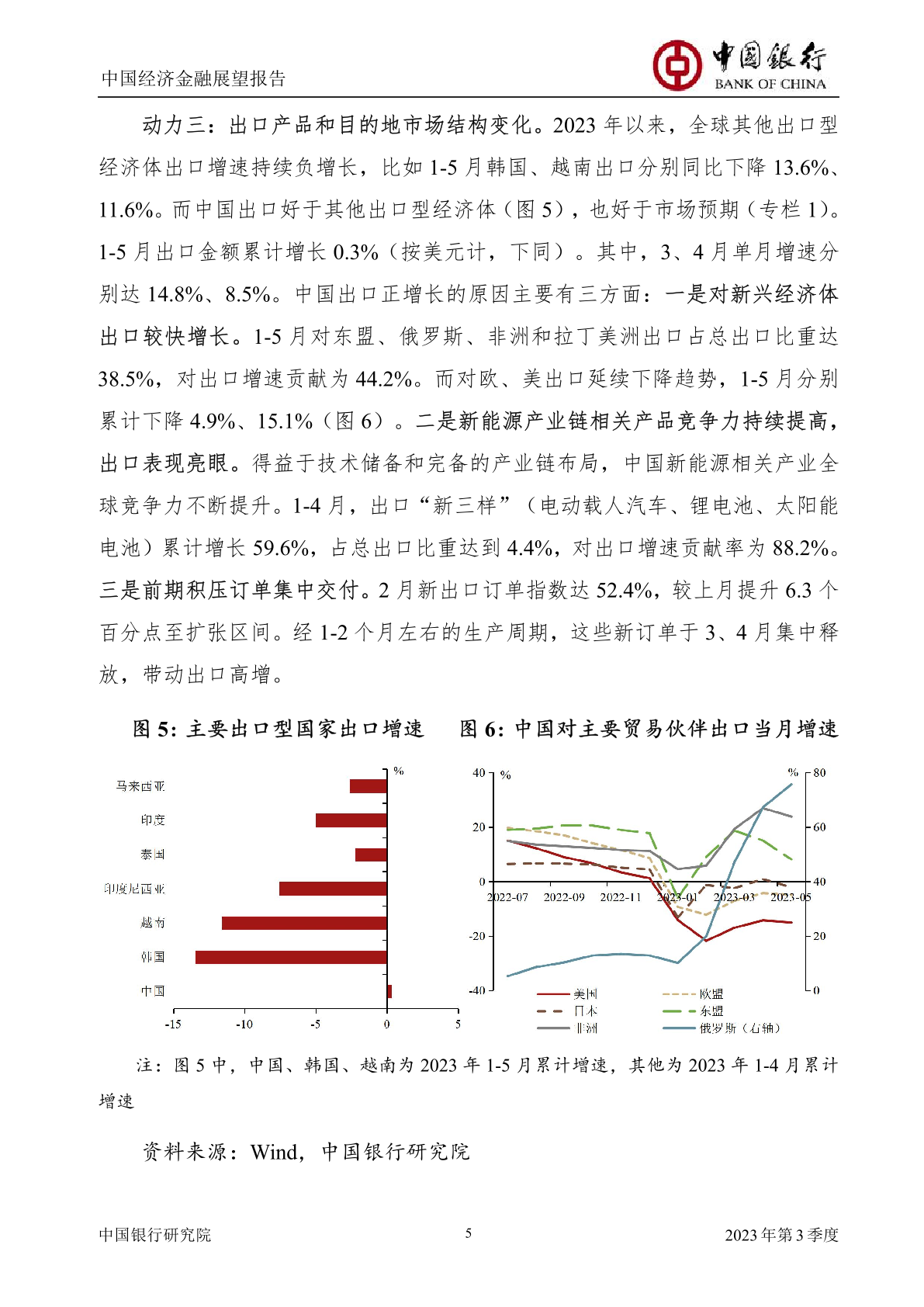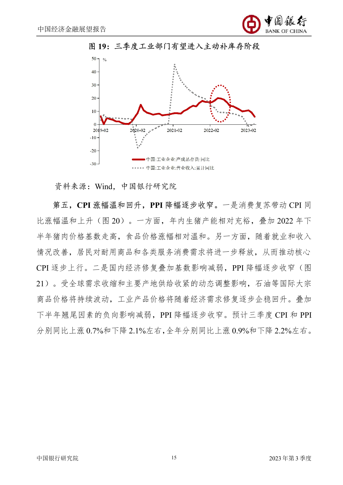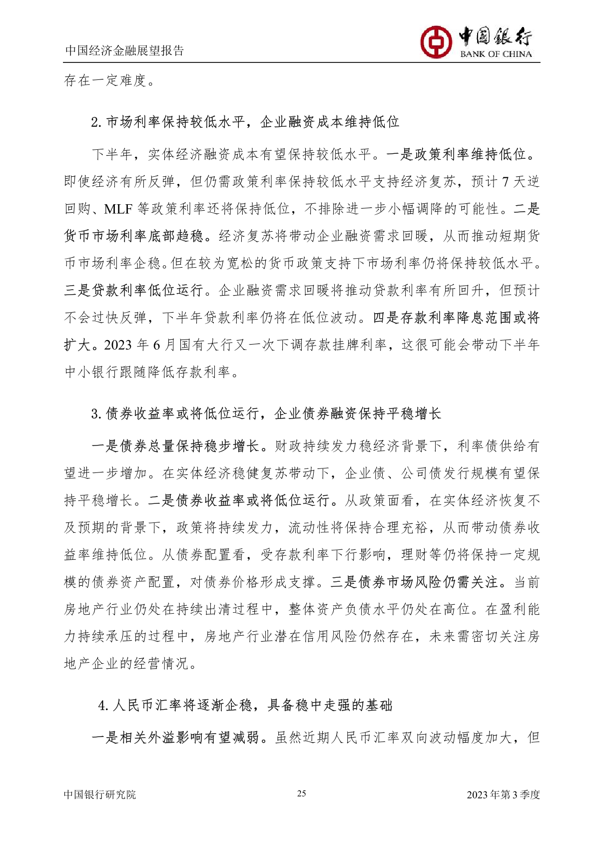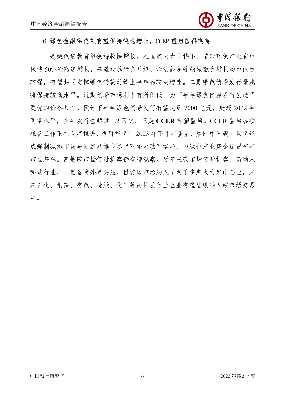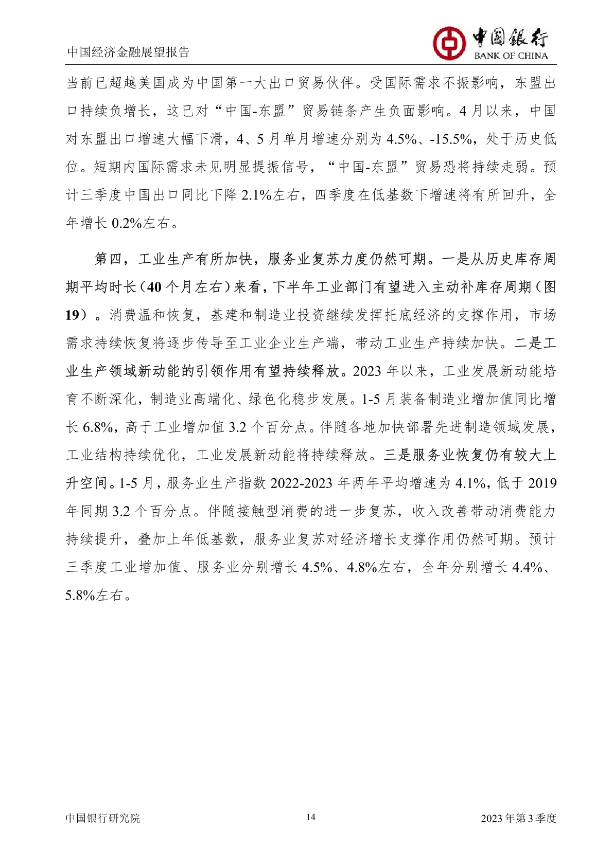 展望下半年,中国经济增长仍将主要取决于内需的恢复 程度。在促消费政策、服务消费加快释放的带动下,消 费有望保持温和修复,基建投资将继续较快增长,高技 术产业投资对制造业投资增长带来支撑,房地产市场逐 步探底修复。总体预计三季度 GDP 增长 4.9%左右,全 年增长 5.4%左右。