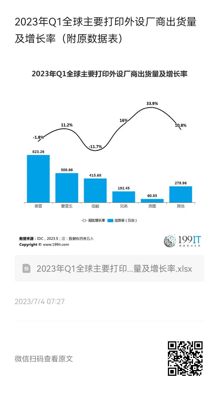 - 2023年Q1全球主要打印外设厂商出货量市场份额(附原数据表)