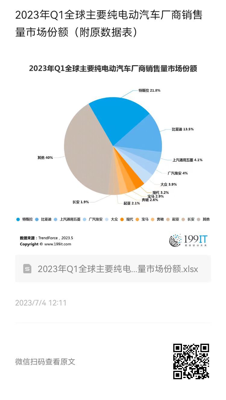 2023年Q1全球主要纯电动汽车厂商销售量市场份额(附原数据表) ​​​