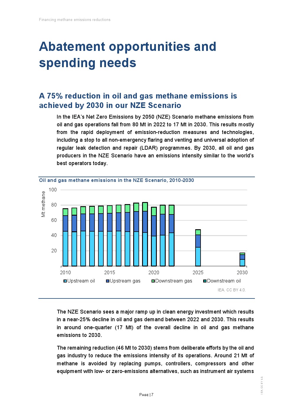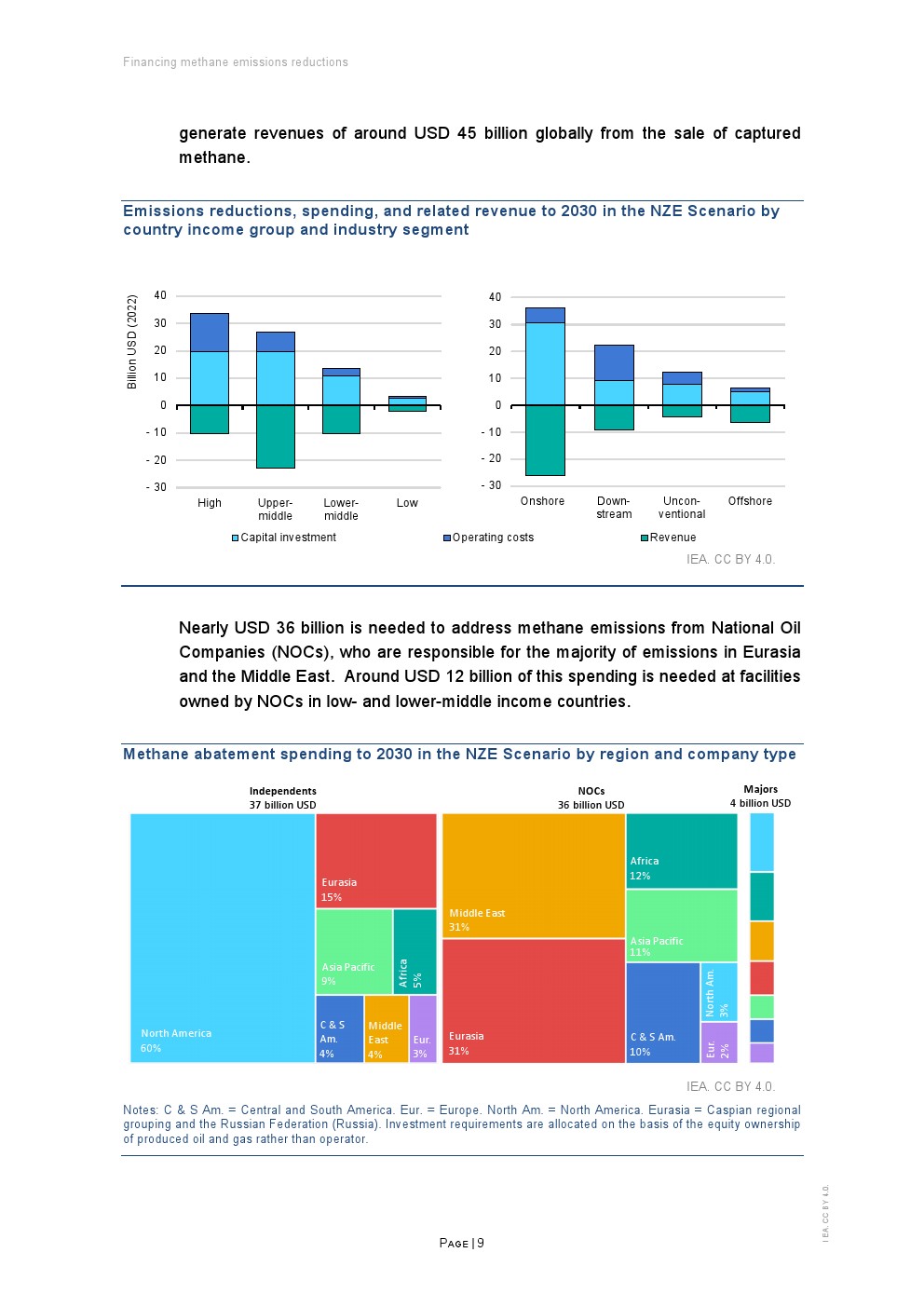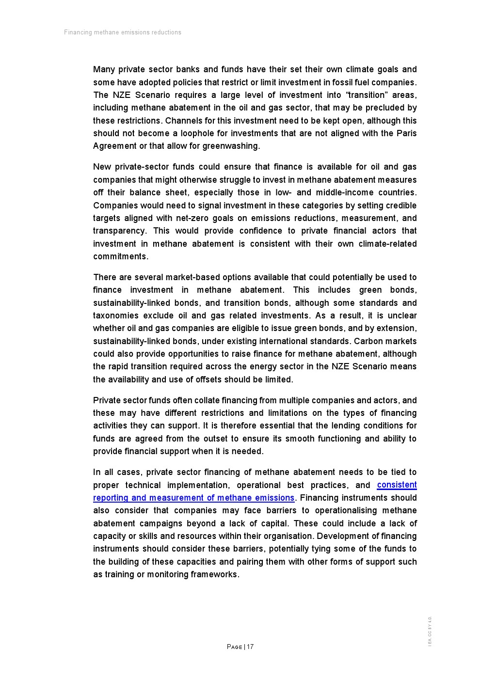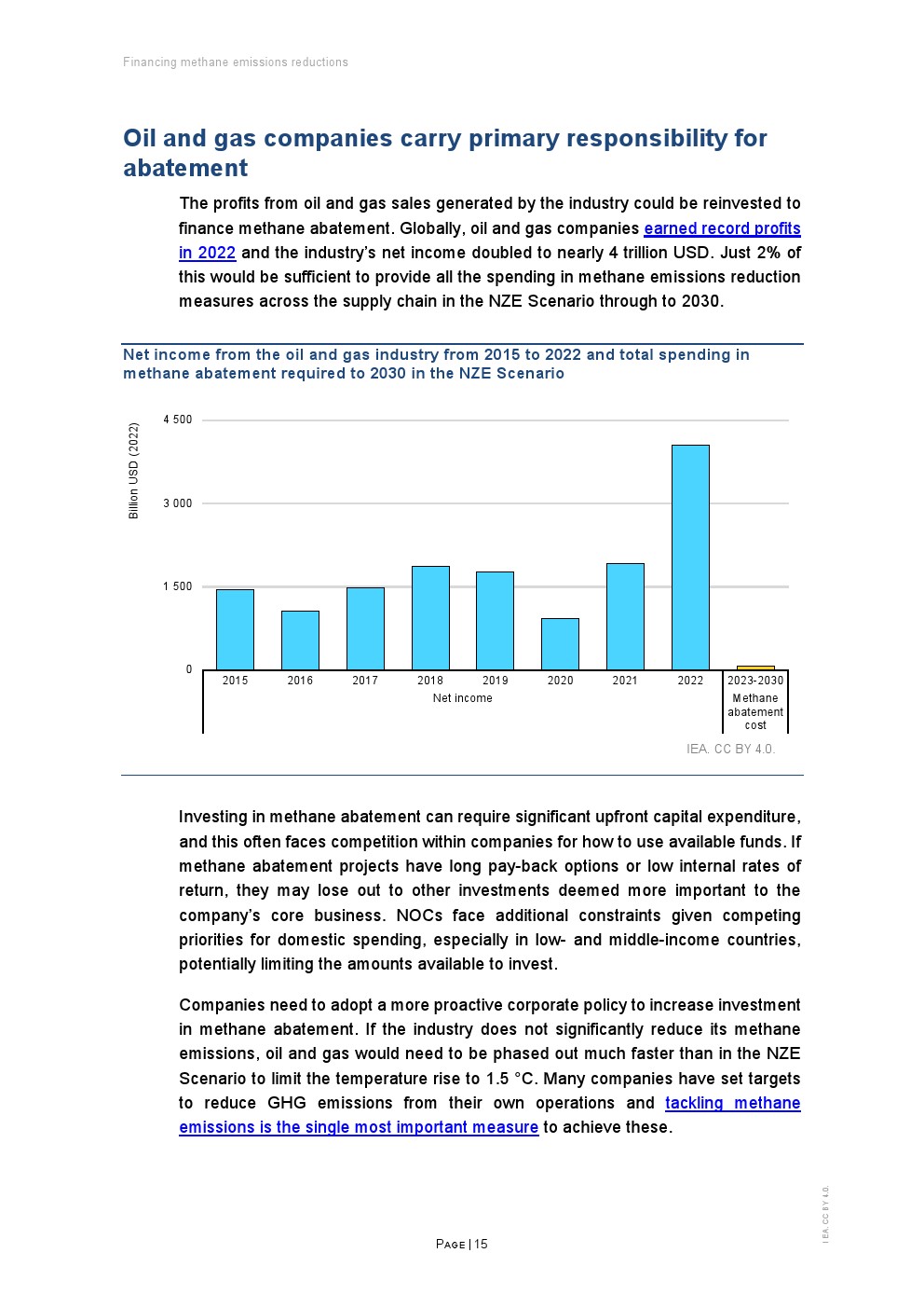 石油和天然气公司对减排负有主要责任。在NZE情景中,减少甲烷排放所需的支出不到2022年该行业净收入的2%。在内部投资选择有限的地方,私人资金来源可以提供支持。甲烷减排的法规和政策对减少甲烷排放至关重要。
