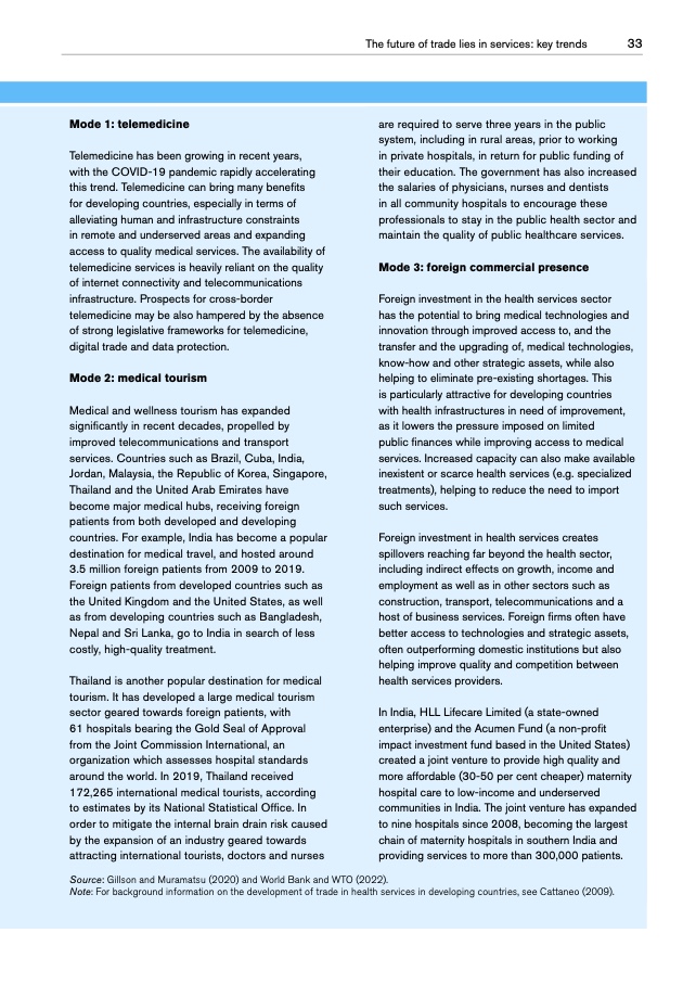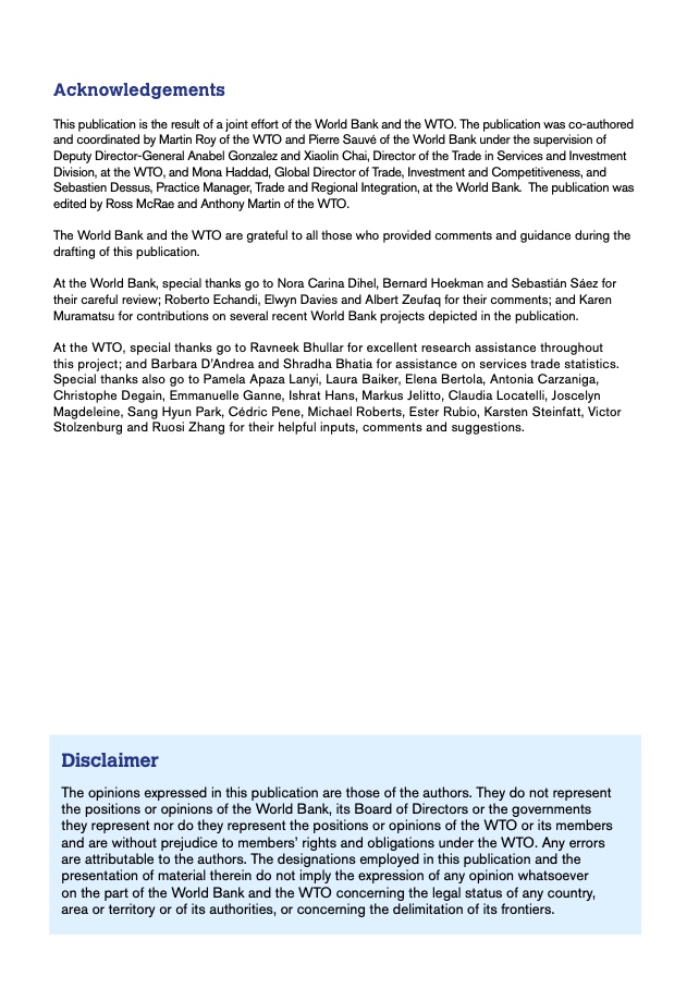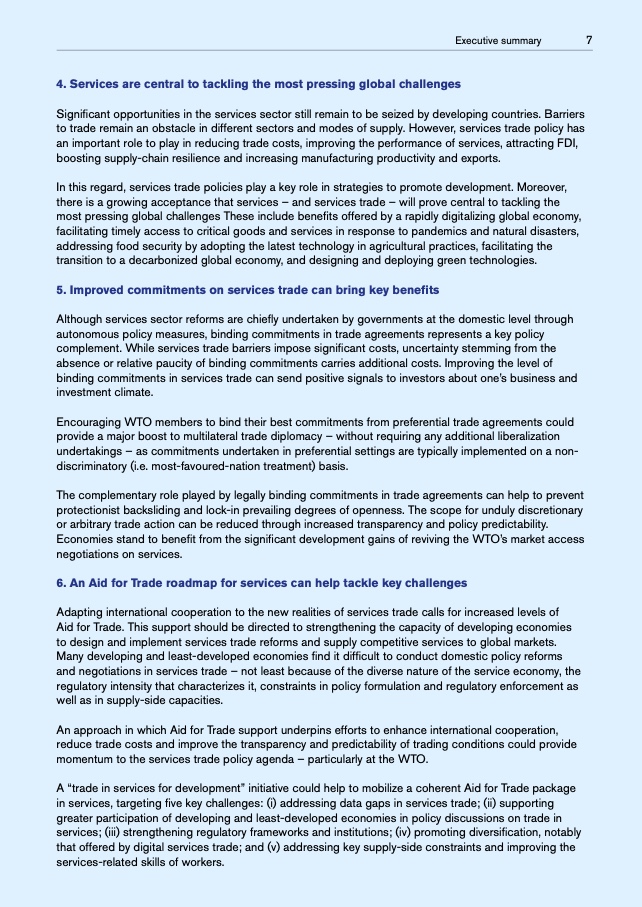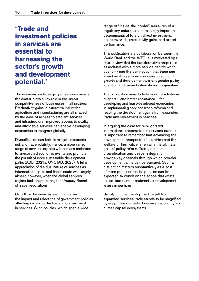 深化服务贸易的国际合作需要更多的贸易援助,因为对于许多发展中经济体来说,在受到大量监管审查的部门进行国内改革和国际谈判仍然是一项挑战。一个“服务贸易促进发展”倡议可以通过调动技术援助和能力建设的资源来支持更深入的国际合作。世贸组织秘书处和世界银行集团随时准备帮助各国政府实现服务贸易的全部发展潜力。